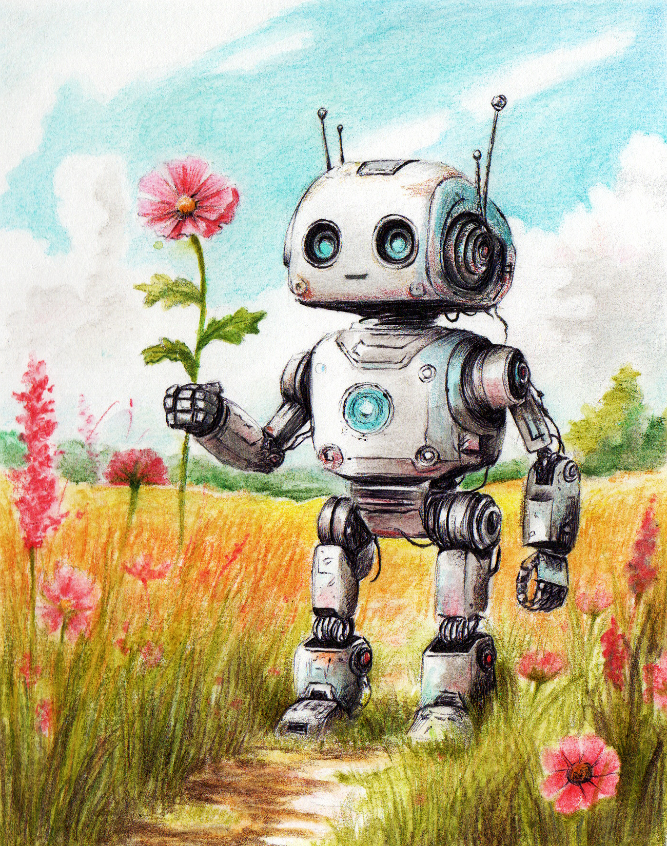 Иллюстрация выполнена вручную на акварельной бумаге цветными карандашами (обычными и акварельными), смешанная техника.