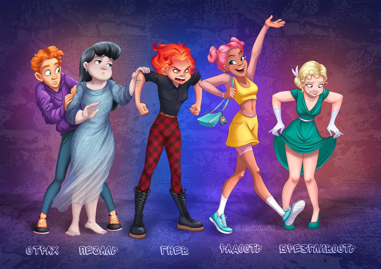 2 часть иллюстрации из серии "эмоции". Здесь изображены персонажи-эмоции: страх, печаль, гнев, радость и брезгливость. Вдохновлено фильмом "головоломка 2""