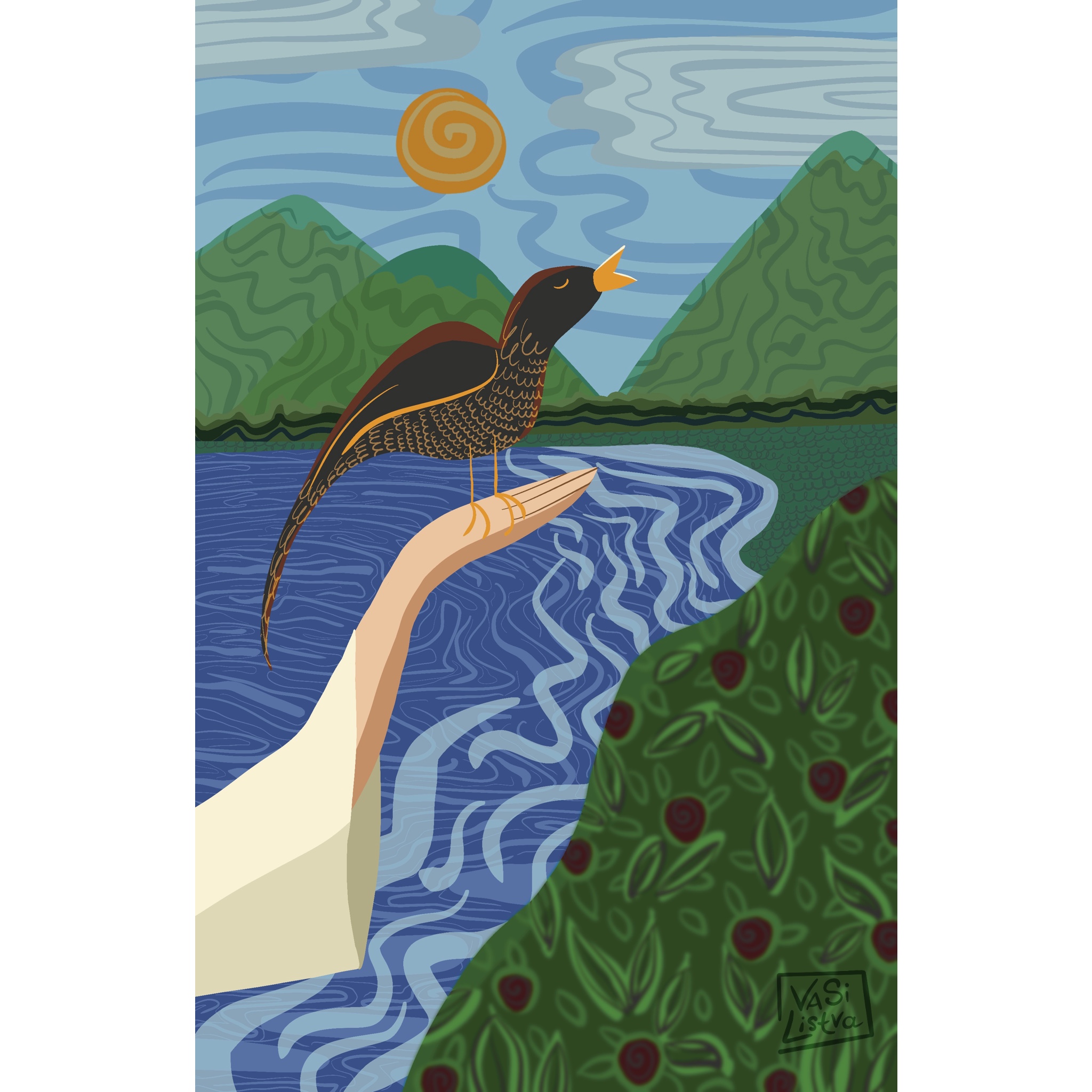 Книга по монгольским мифам. Дева - дух леса наслаждается пением птицы.