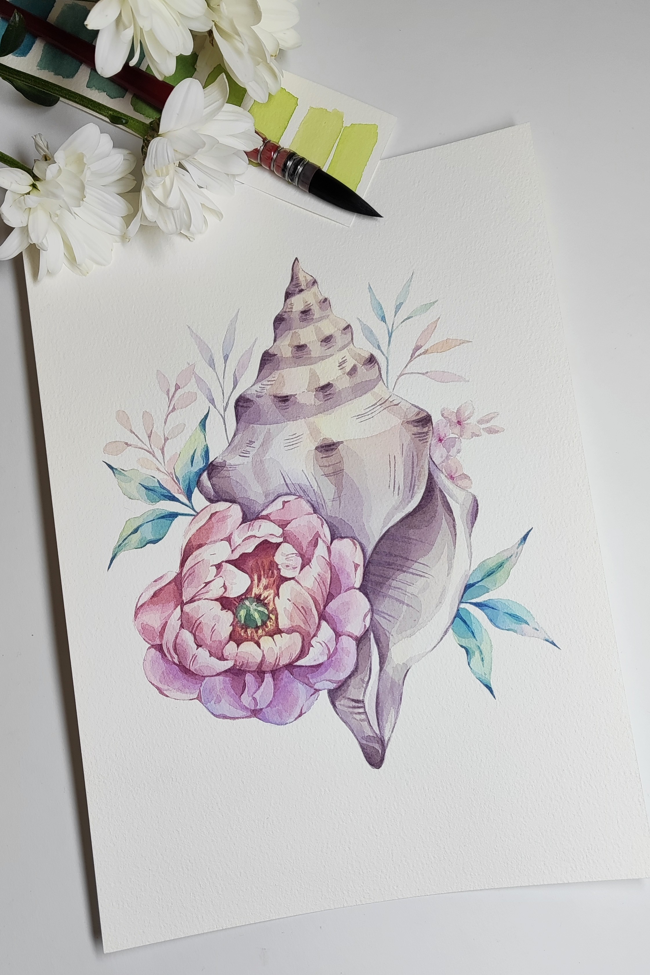 Морская ракушка с цветами акварелью