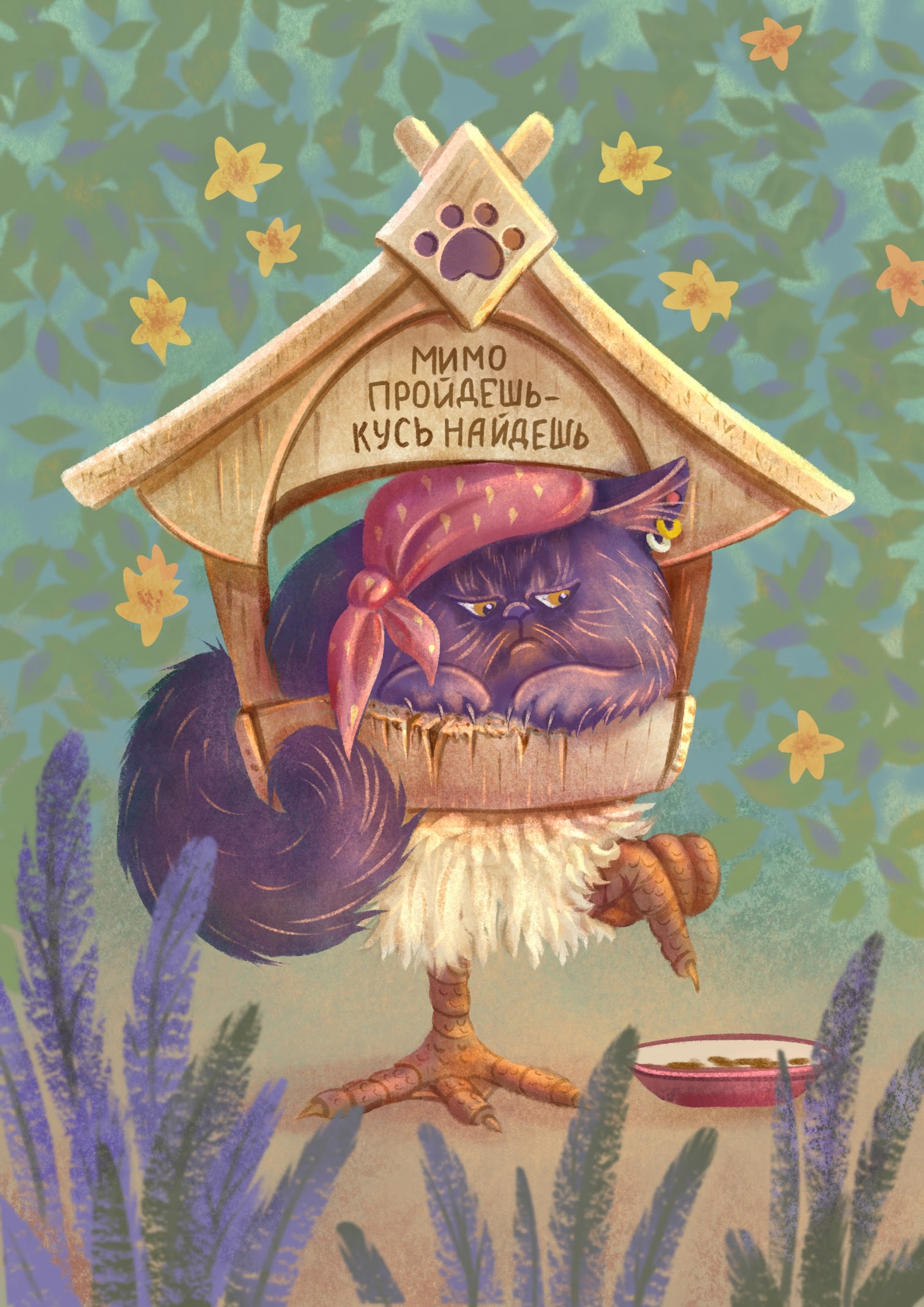 Черный кот в избушке на курьих ножках. Открытка.