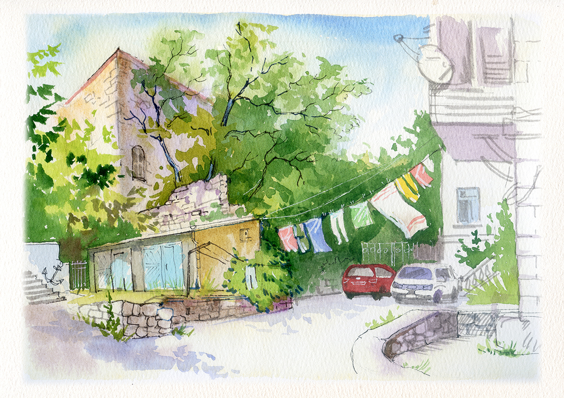В центре Севастополя белье традиционно сушат на улице, бельевые веревки натянуты везде, как снасти корабля, а чьи-то выстиранные кальсоны напоминают диковинные флаги)