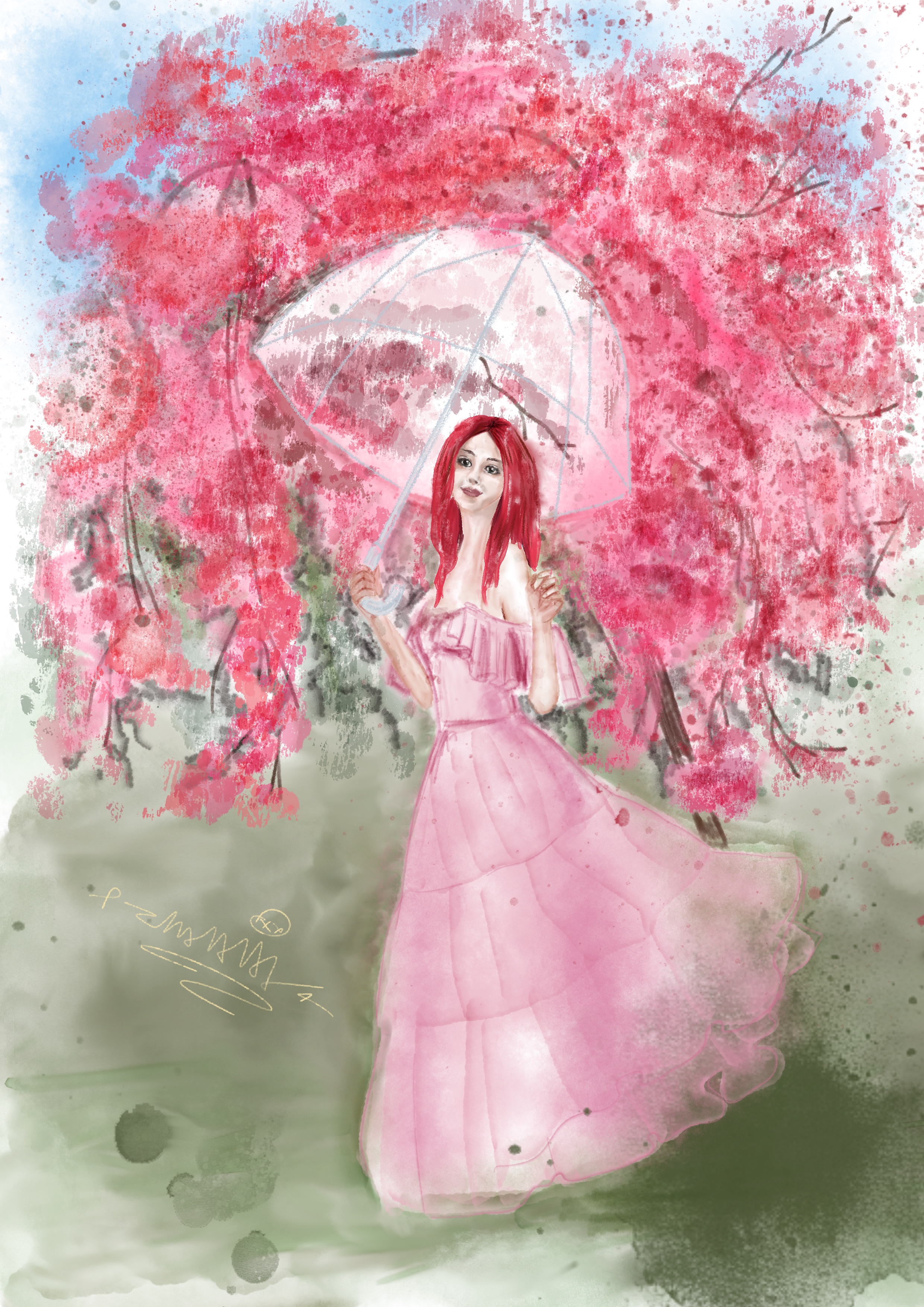 Девушка в цветущих яблонях с красными цветами под зонтом