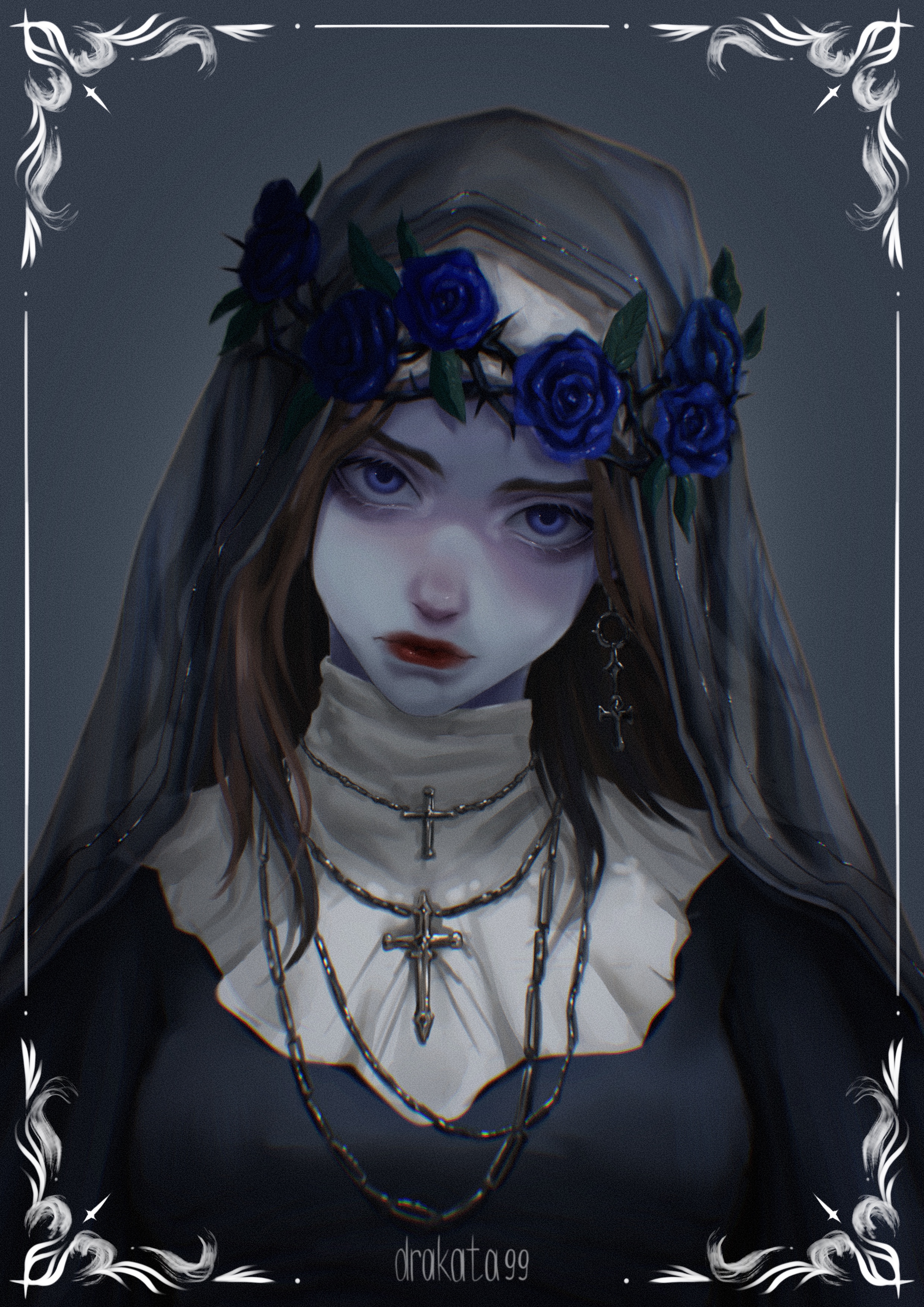 Девушка в образе монашки с венком из роз на голове.