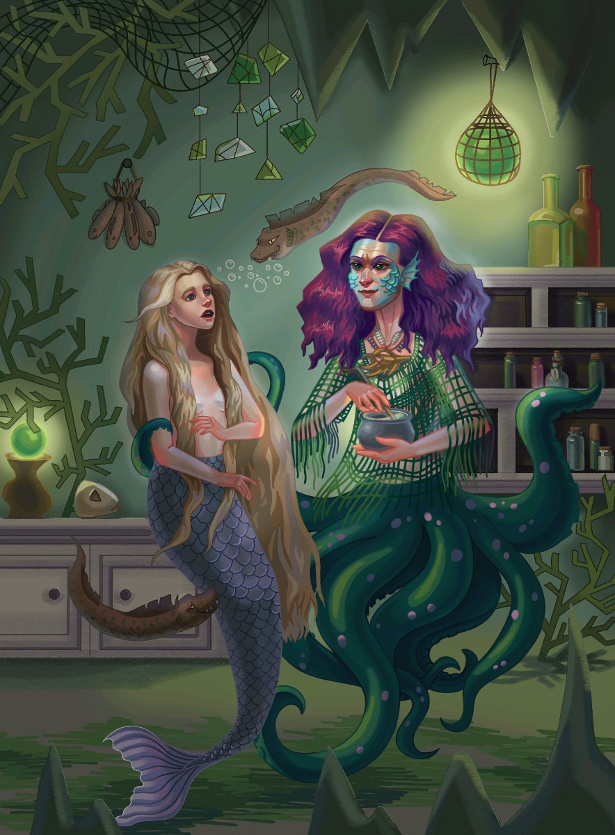 Иллюстрация к сказке Андерсена "Русалочка". Изображена Русалочка, которая приплыла к морской ведьме за помощью.