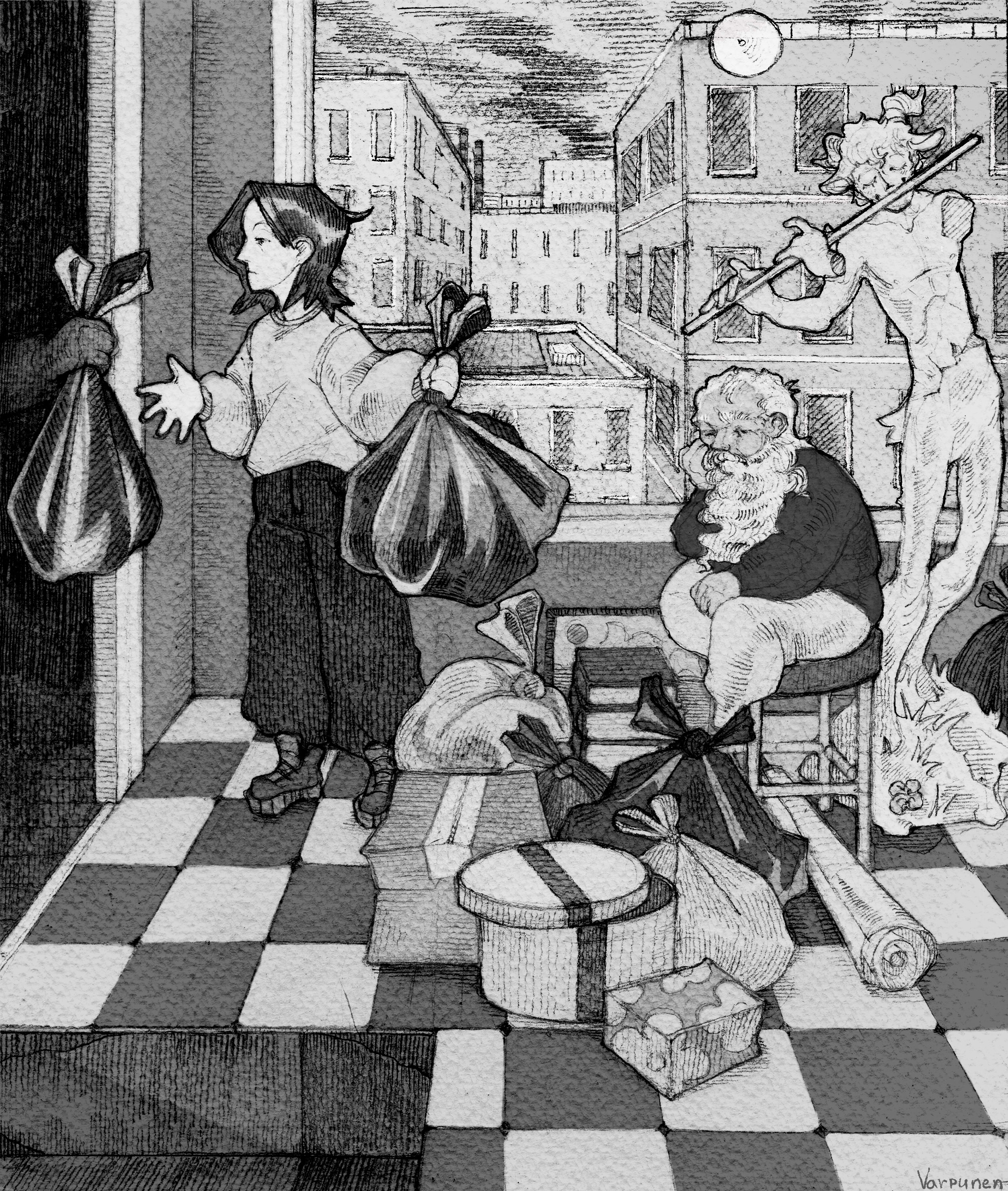 Визуализация моего сна, где люди делают непонятно что непонятно зачем. Карандашный рисунок, тон наложен на компьютере.