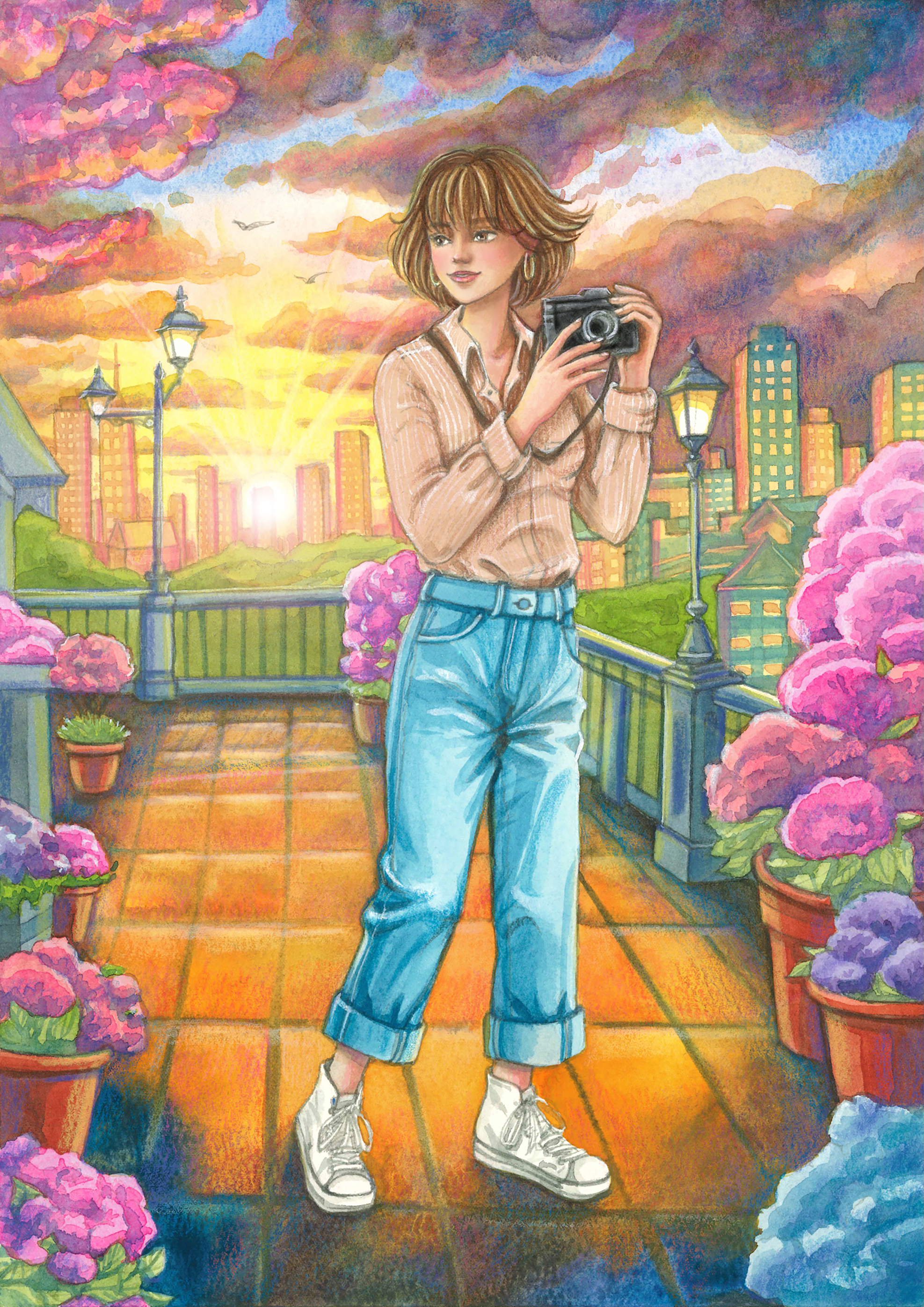 На обзорной площадке города с фотоаппаратом. Иллюстрация
