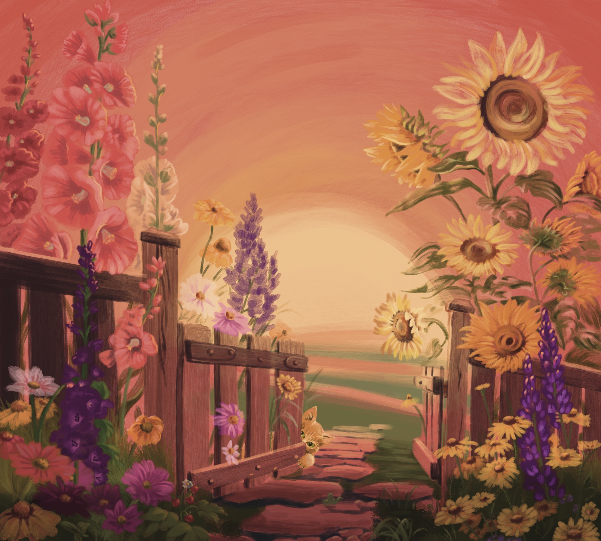 Красота закатного солнца в разгар лета, слышно, как стрекочут кузнечики в ожидании свежего воздуха после знойного дня