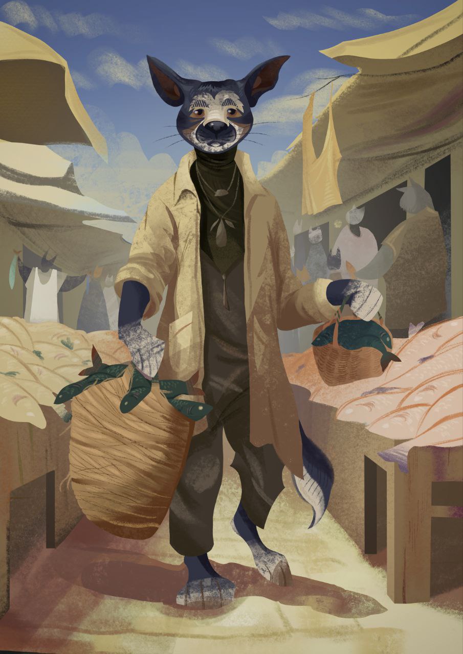 Пес на рыбном рынке