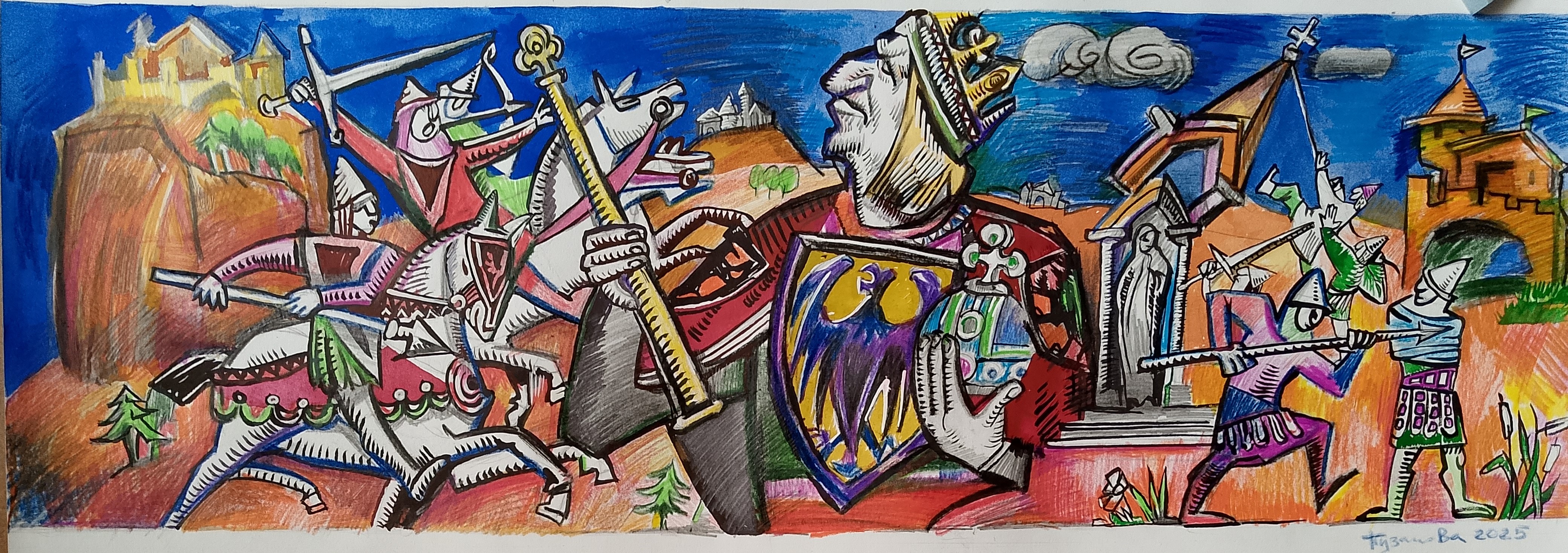 А Стрельников (автор текста): "Обладая широким спектром возможностей, данным первоклассной художнице, автор иллюстрации не ограничивает себя каким- либо конкретным стилем или манерой. Ей подвластны как реалистические работы в отличной живописной технике, так и стилизации. Новая работа представляет собой стилизацию под аитраж, очень яркий, будто подсвеченный изнутри. Также можно провести аналогии с ксилографией, весьма соответствующей теме. Хронологически иллюстрация связана с большой предыдущей работой, на которой была изображена правящая династия фон Штауфенов в расцвете их могущества. Но их власть пошатнулась, наступила пора безвременья и смуты. Рыцари- разбойники при отсутствии жесткой верховной власти промышляли разбоем и грабежами. Новый кайзер Рудольф фон Габсбург( нарисован в середине композиции) одной из первых задач своего правления поставил вопрос ребром- раздавить разбойничье рыцарство. Слева показаны три рыцаря из рода фон Розенштайнов. Изюминкой для зрителей является цитирование всадников Апокалипса Дюрера, как воплощение злодейства. Жезлом кайзер преграждает им дорогу, останавливает взбесившуюся стаю. Широко разветвленная династия фон Габсбургов во всей полноте представлена на полотнах, входящих в сокровищницу мировой живописи . На портретах отчетливо видна объединяющая королей и королев разных эпох и стран анатомическая особенность, называемая " габсбургской губой". Хотя изображенный на иллюстрации Рудольф фон Габсбург один из родоначальников династии и анатомическая особенность была у него еще не так сильно выражена, художница подчеркнула ее для полной узнаваемости образа. Работа и в целом, и в деталях получилась очень выразительной, насыщенной по цвету и динамике."