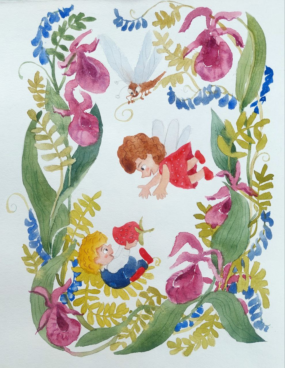 Феечка и фей. Фей предлагает феечке землянику. Они изображены среди полевых цветов.