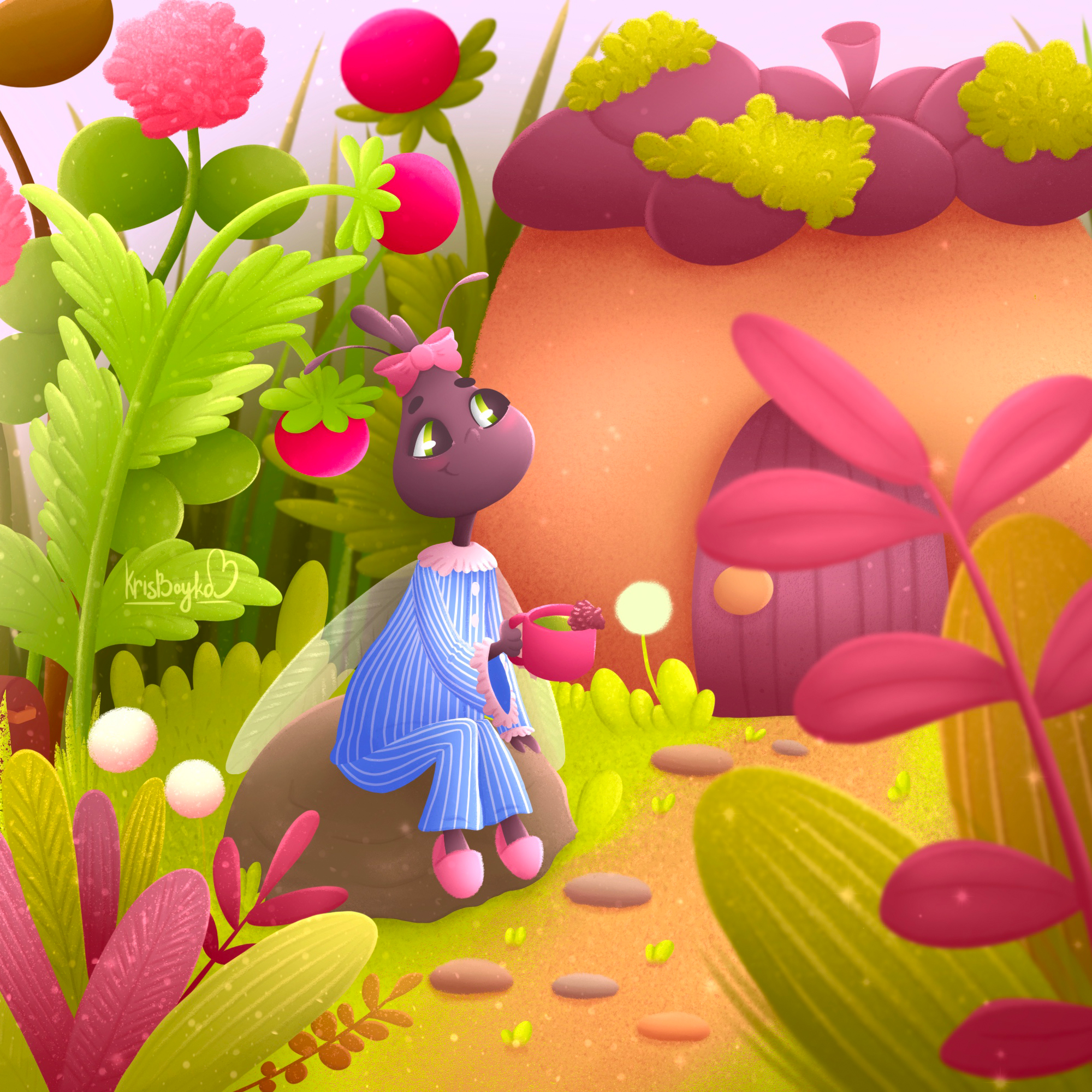 Иллюстрация создана для разворота детского рассказа о Муше. Муша - модная и обаятельная мушка, которая живёт в домике из мха и желудей, пьёт кофе с еловым безе и делает зарядку для крылышек.