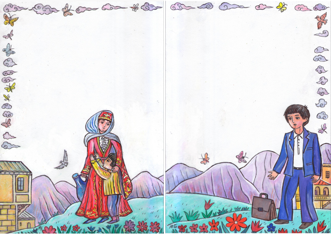 Иллюстрации для детских стихов. Разворот. Пустое место оставлено для текста. Иллюстрация для детского журнала «НОГДЗАУ»(Пионер). Опубликовано. Журнал издаётся в Республике Северная Осетия—Алания, во Владикавказе. Журнал на русском и осетинском языках. Техника иллюстрации: Бумага, гуашь, акрил, тушь. Художник Марат Брызгалов.