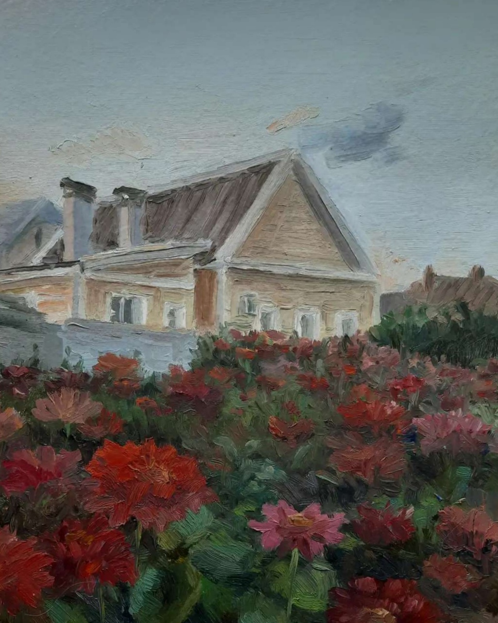 "Циннии", 25 ×20см, грунтованный картон, масло, 2021г