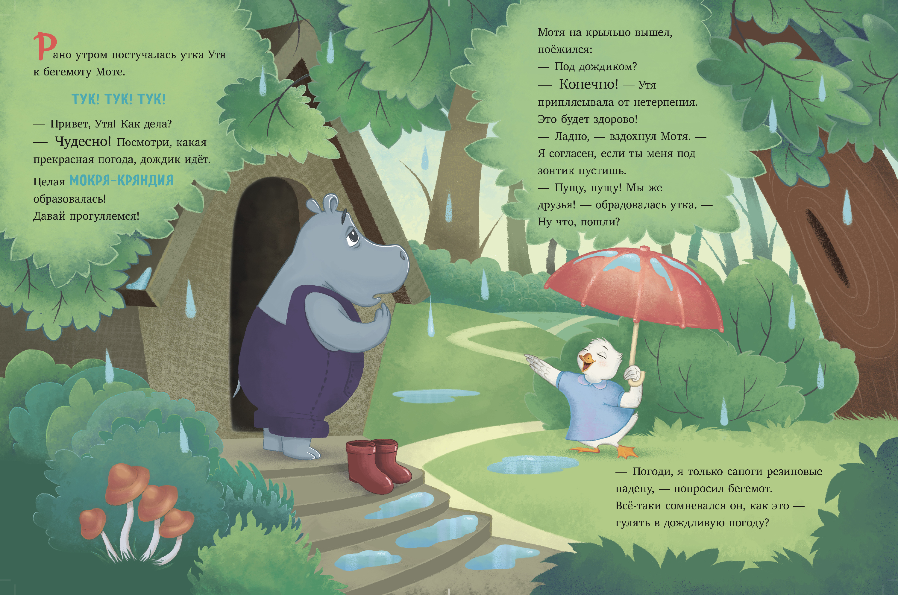 Иллюстрация для детской книжки-картинки (3-5 лет) про уточку Утю и бегемотика Мотю.