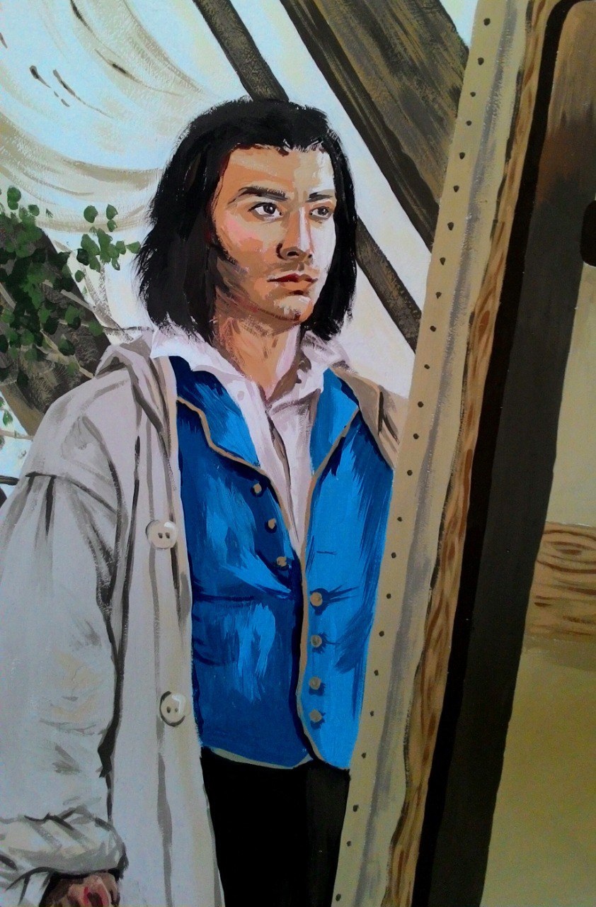 Роспись стены акрилом в мастерской драмтеатра. За основу взята сцена из сериала "Отчаянные романтики" (о прерафаэлитах).