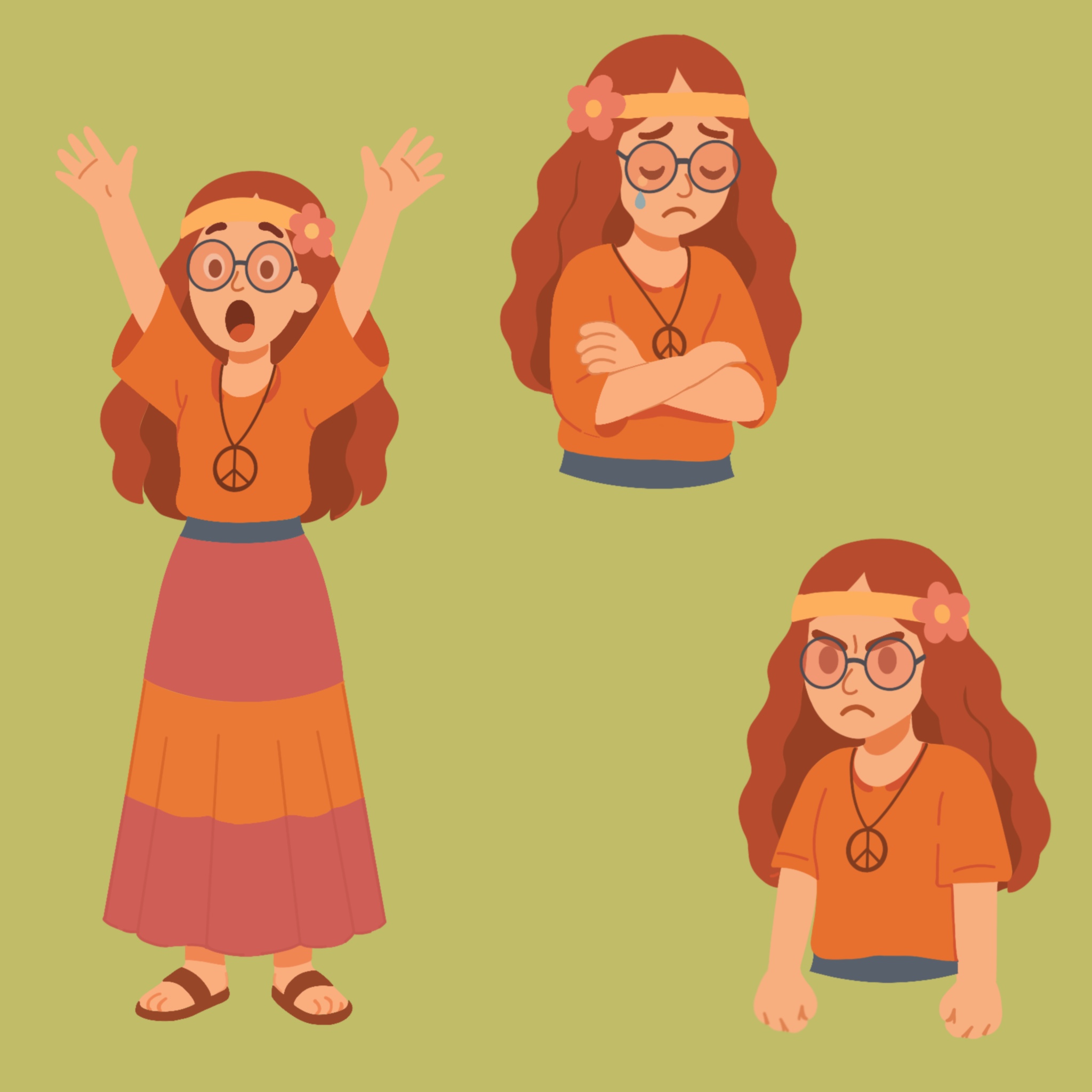 Разработка персонажа "девушка-хиппи". Растровая иллюстрация, которую можно использовать в социальных сетях, печатной продукции или как бренд=персонажа.