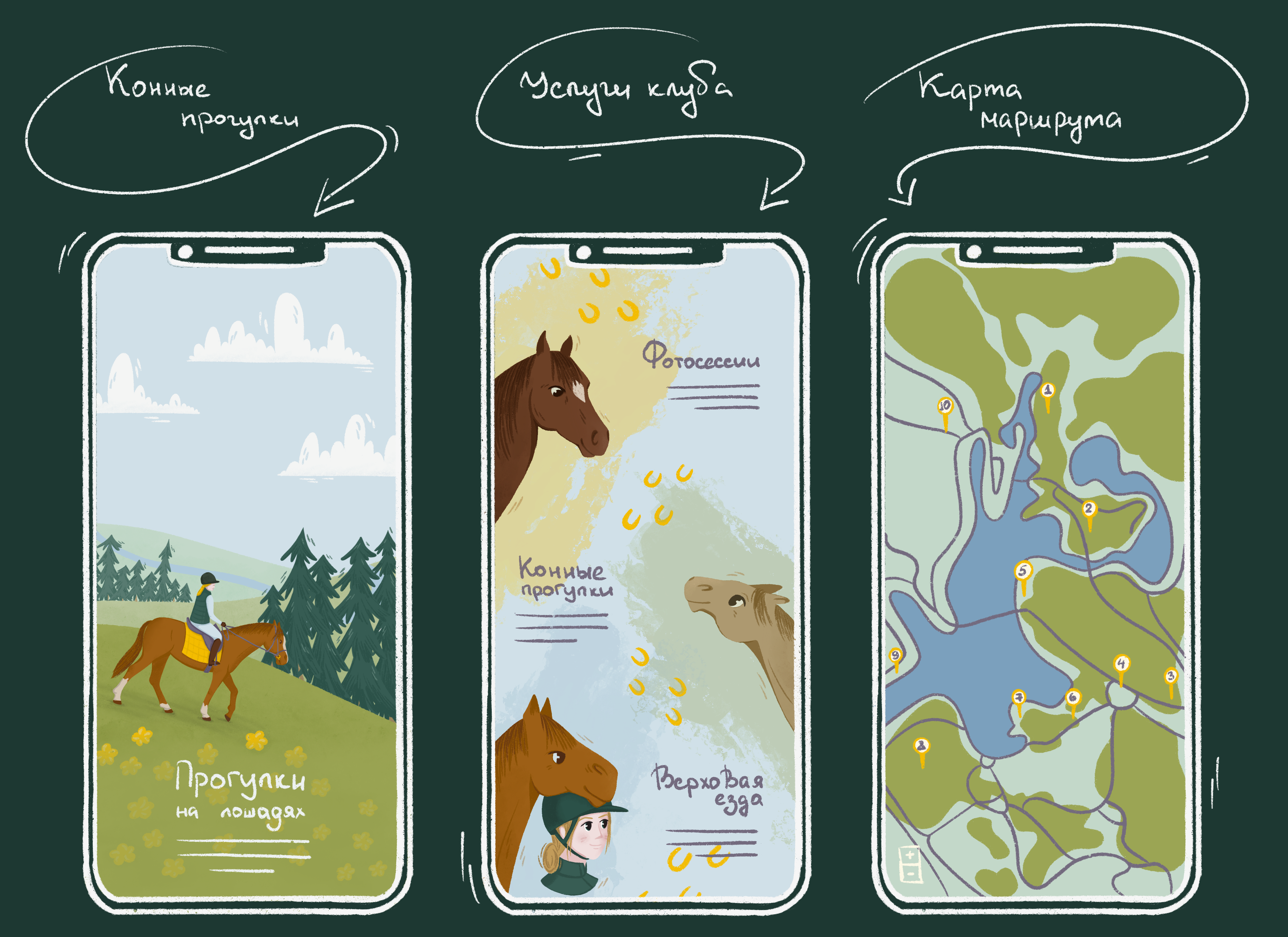 Иллюстрация для мобильного приложения конного клуба. Содержит три варианта экрана
