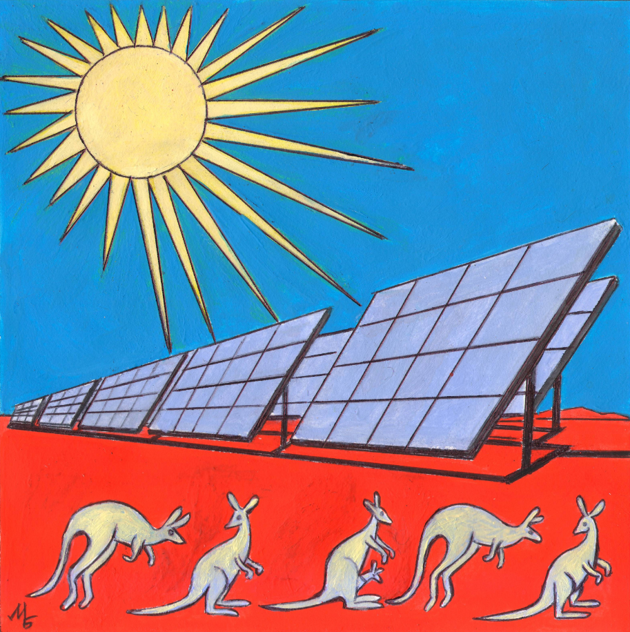 В журнал "А почему?" Рубрика" Со всего света". Редакция-Юный техник. Опубликовано. Тема: Солнечные батареи Австралии. Иллюстрация с расчётом на уменьшение. Художник: Марат Брызгалов.