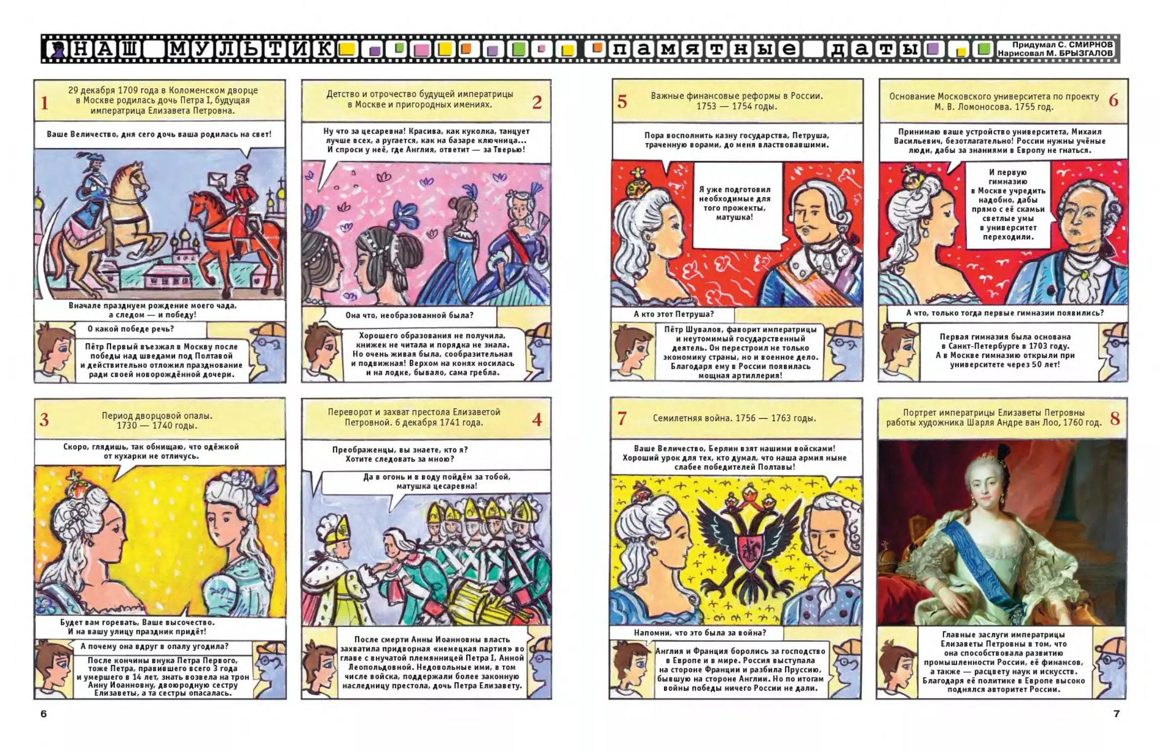 Иллюстрации для детского журнала "А почему? «Комикс. Рубрика -"Наш мультик" » Тема: Российская императрица Елизавета Петровна . Стиль иллюстрации декоративный. Художник Марат Брызгалов.