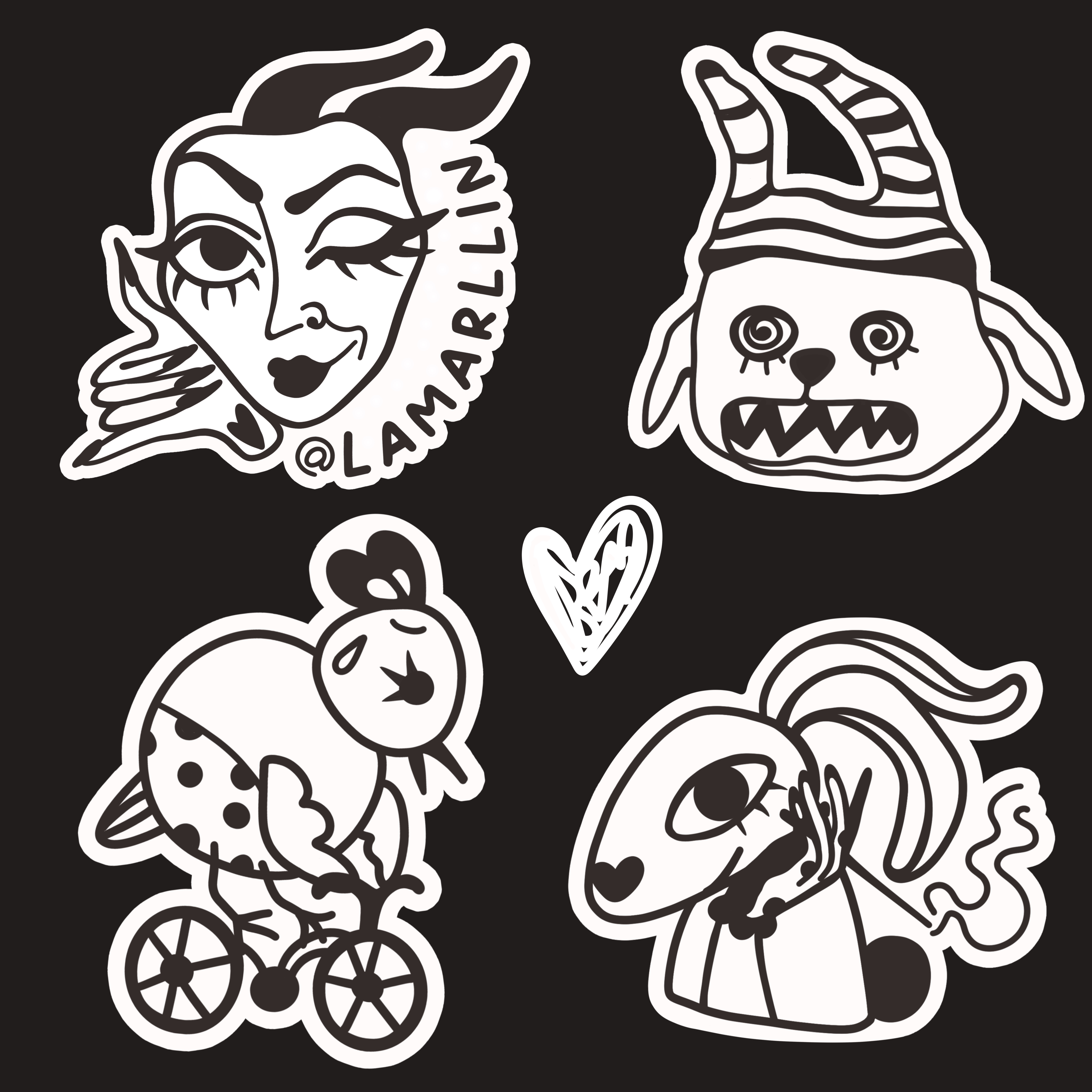 Стикерпак из разных персонажей с эмоциями и мемами. Контурные стикеры. персонажи животные. Птица на велосипеде. Заяц с перчатками. Собака в шапке. Женщина с рогами. Лайн черно- белый