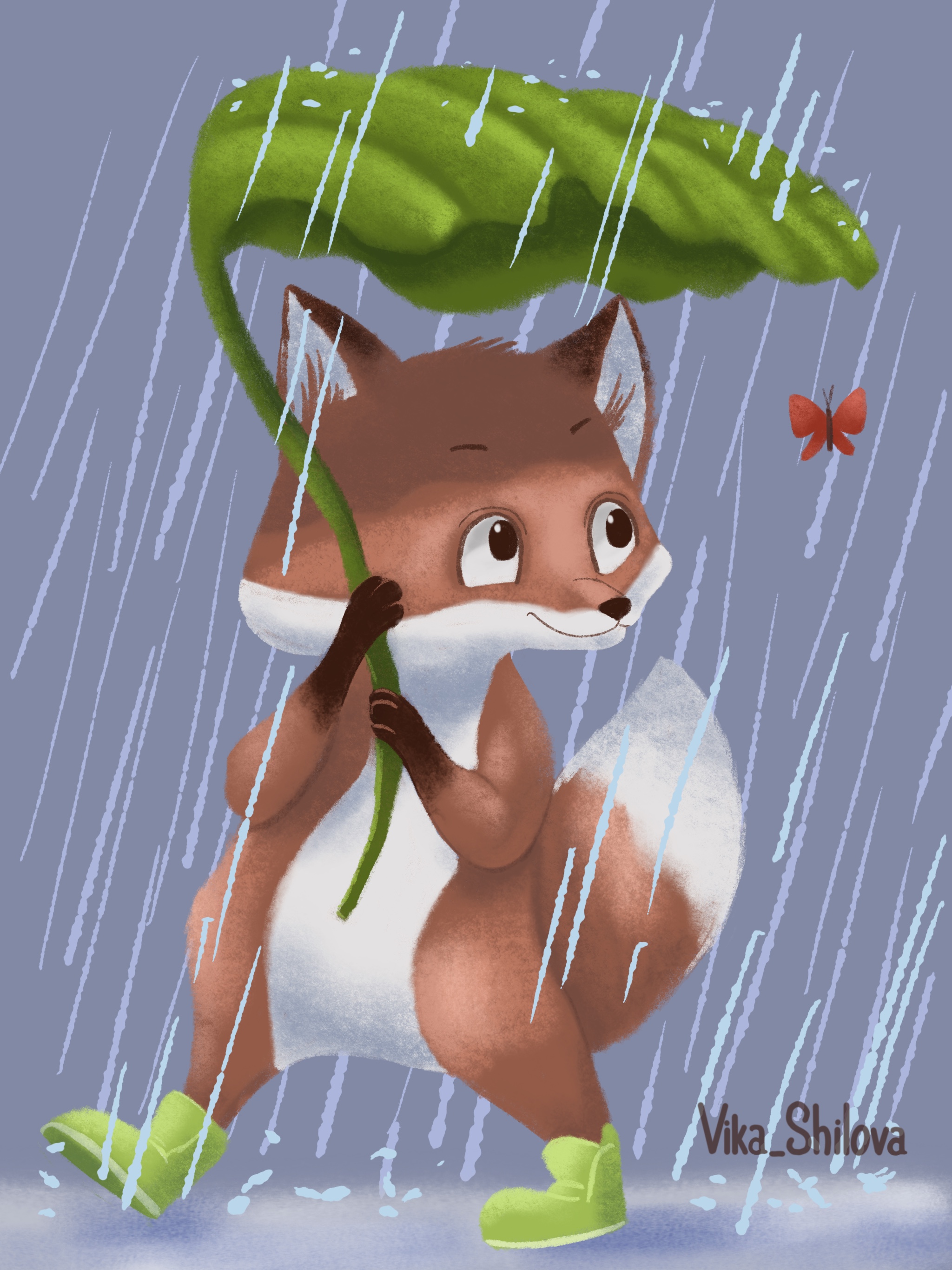 Лисенок под лопухом во время дождя смотрит на бабочку