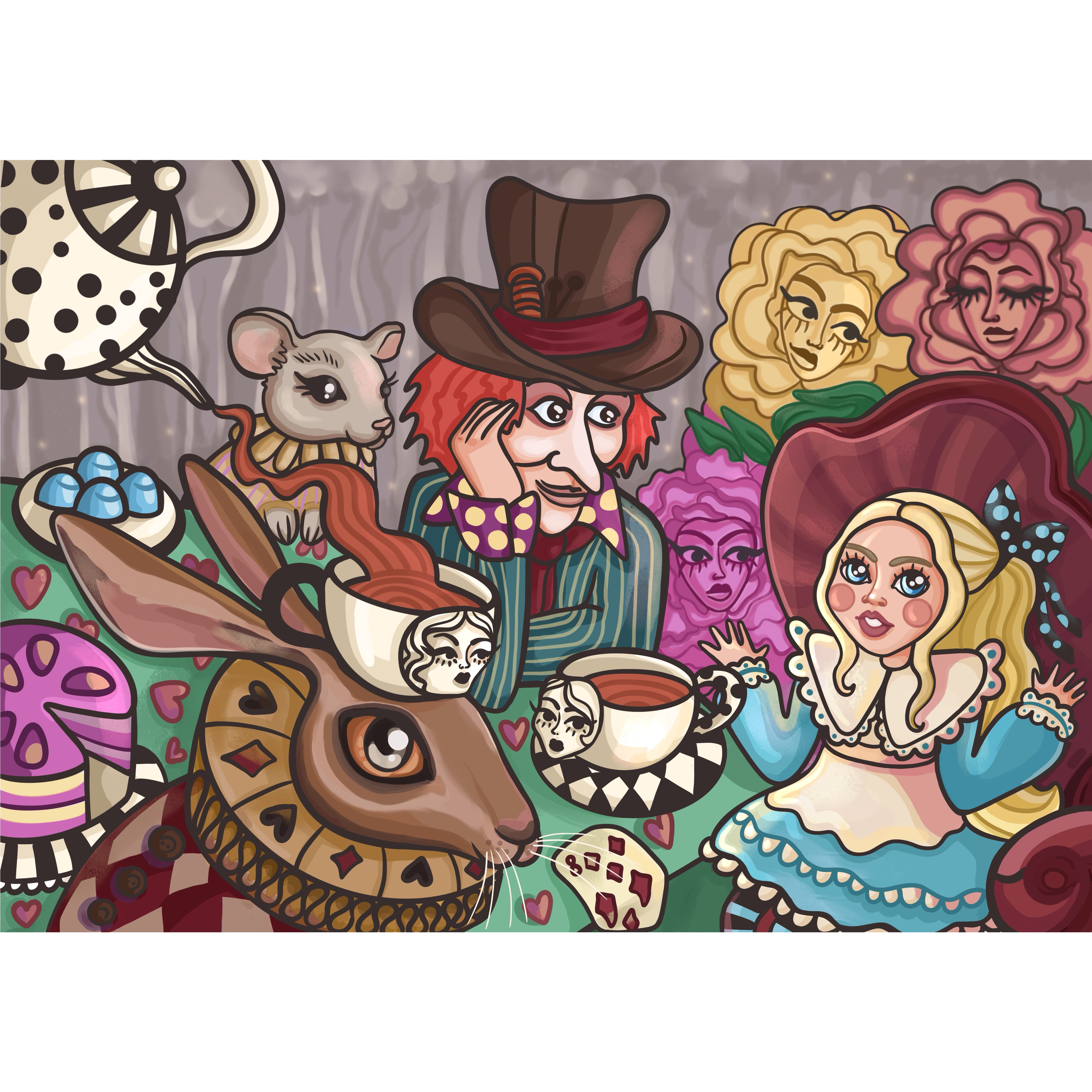книжная иллюстрация Алиса в стране чудес. Девочка за столом в компании шляпника, кролика, мышки и роз. Стол с чайным сервизом и чаем, торт карты и сладости. Алиса в зазеркалье, сюрреализм, лайн, контура.