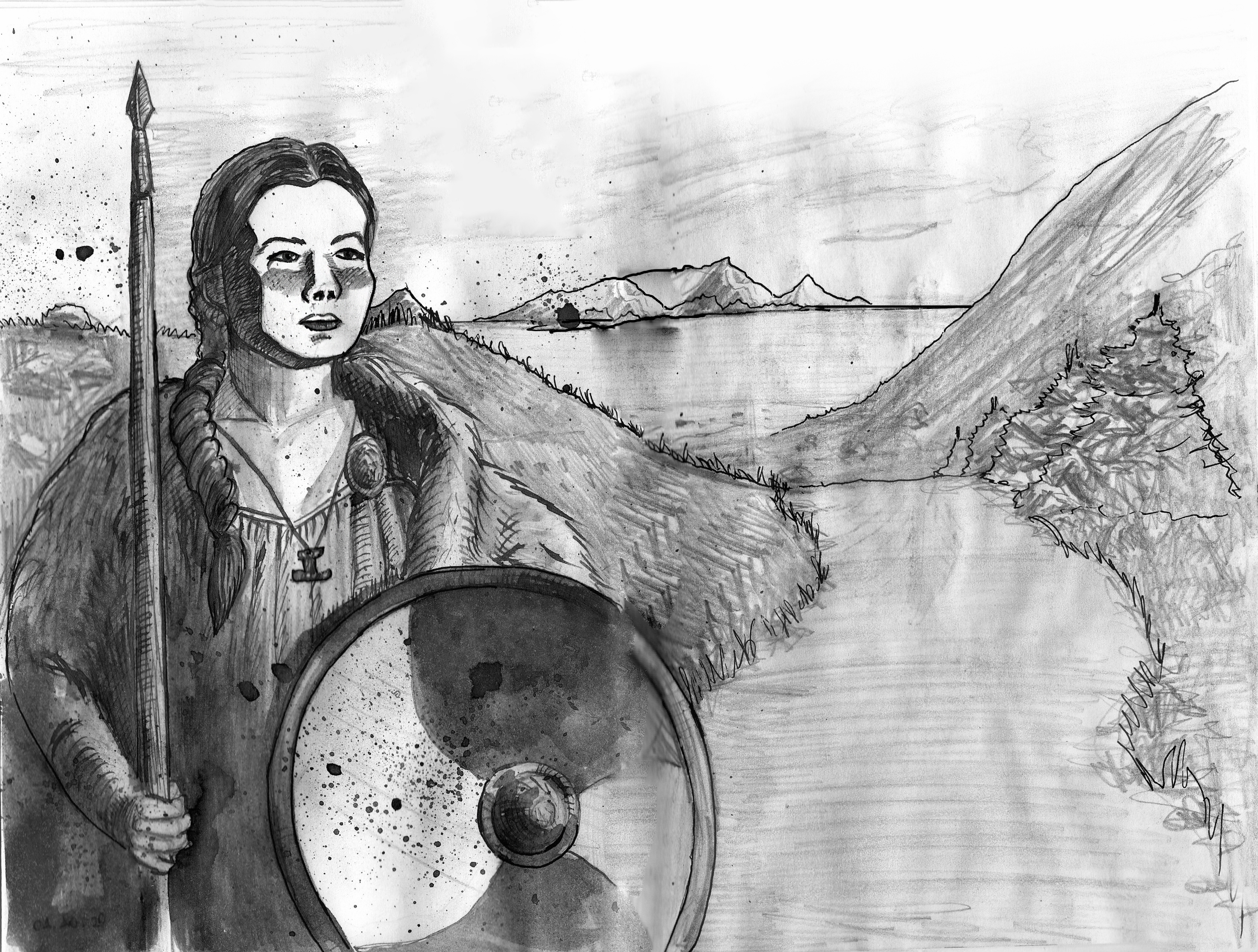 Женщина-викинг с копьем на фоне скандинавского пейзажа