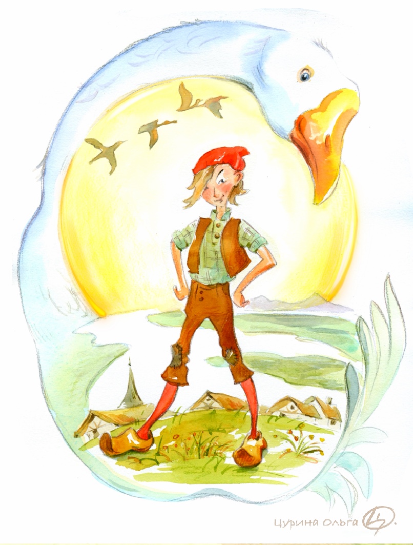 Нильс стоит вроде на лужайке возле дома, а вроде как на спине гуся Мартина. И силуэт Мартина заключает в себе огромный мир, который Нильс познал путешествуя на спине своего друга до далекой Лапландии, страны с незаходящего летом солнца