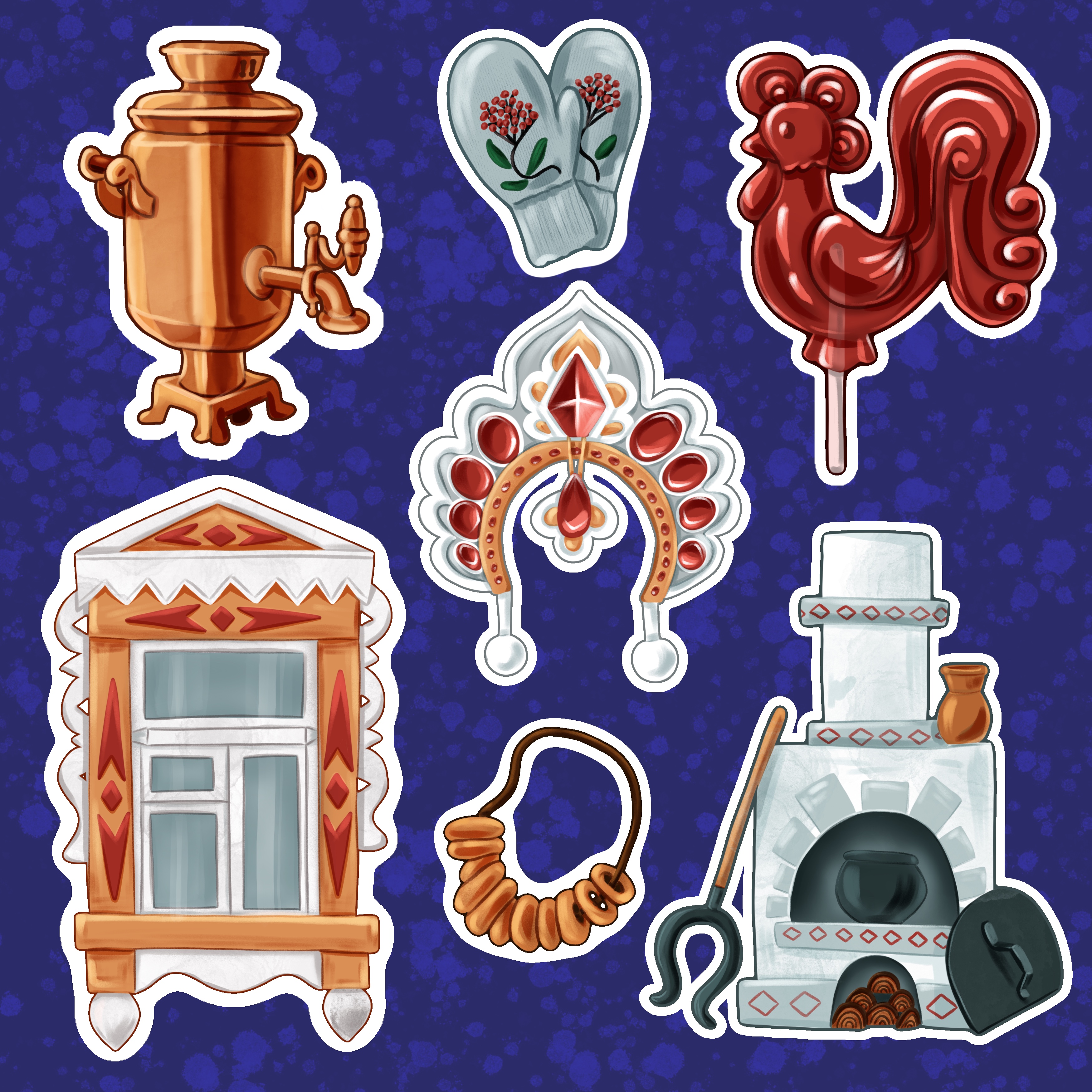 Набор цифровых стикеров с элементами традиционного интерьера: резные наличники, печь, кокошник, самовар и другие детали деревенского быта. Иллюстрации выполнены в народной эстетике, вдохновлённой славянскими мотивами.