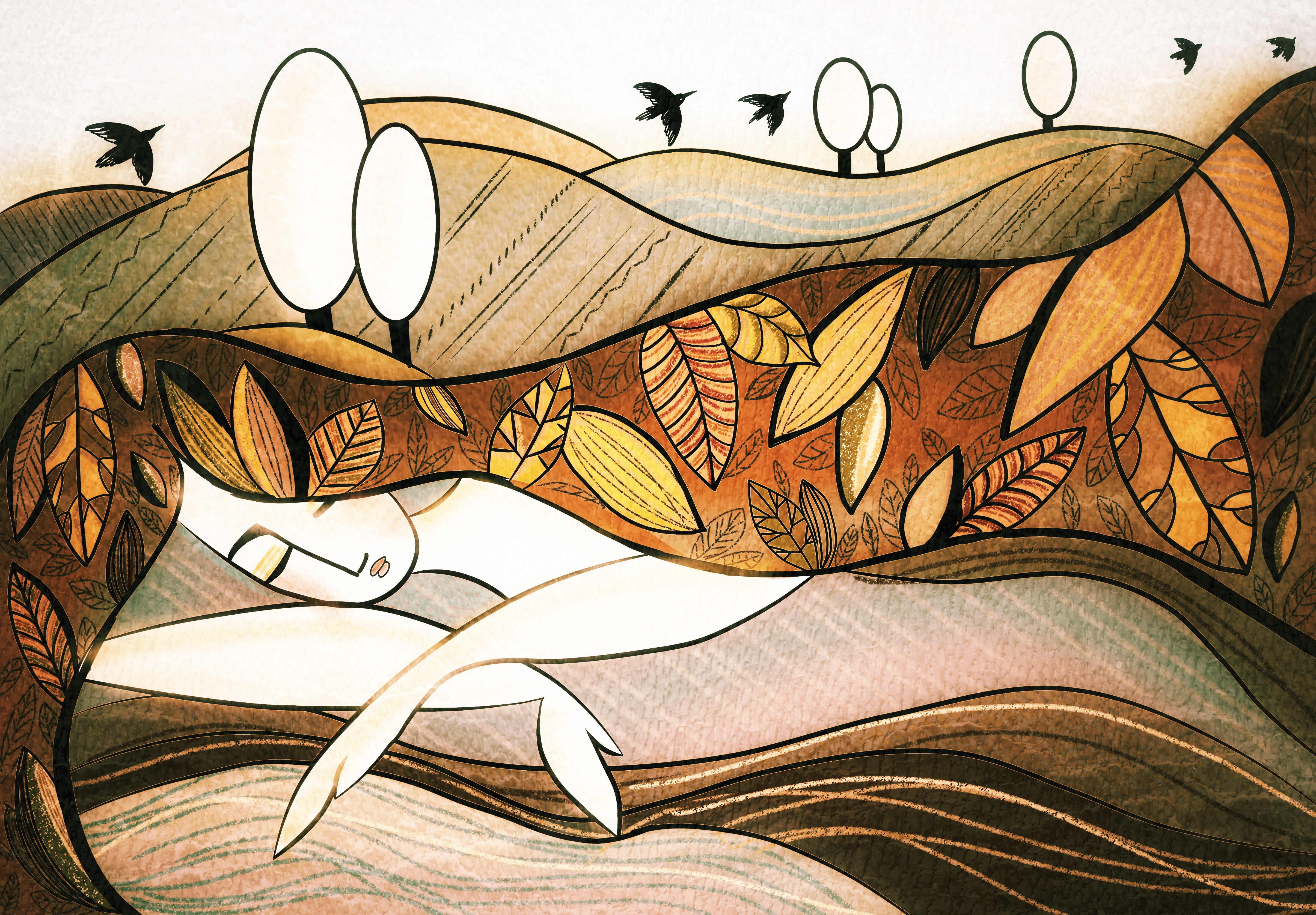 Листья ложатся неторопливо, как страницы старой книги, сохраняя в себе дыхание лета и предчувствие зимы. Фигура, укрытая землёй, будто становится частью этого великого цикла: природа увядает не для того, чтобы исчезнуть, а чтобы обрести новый покой.