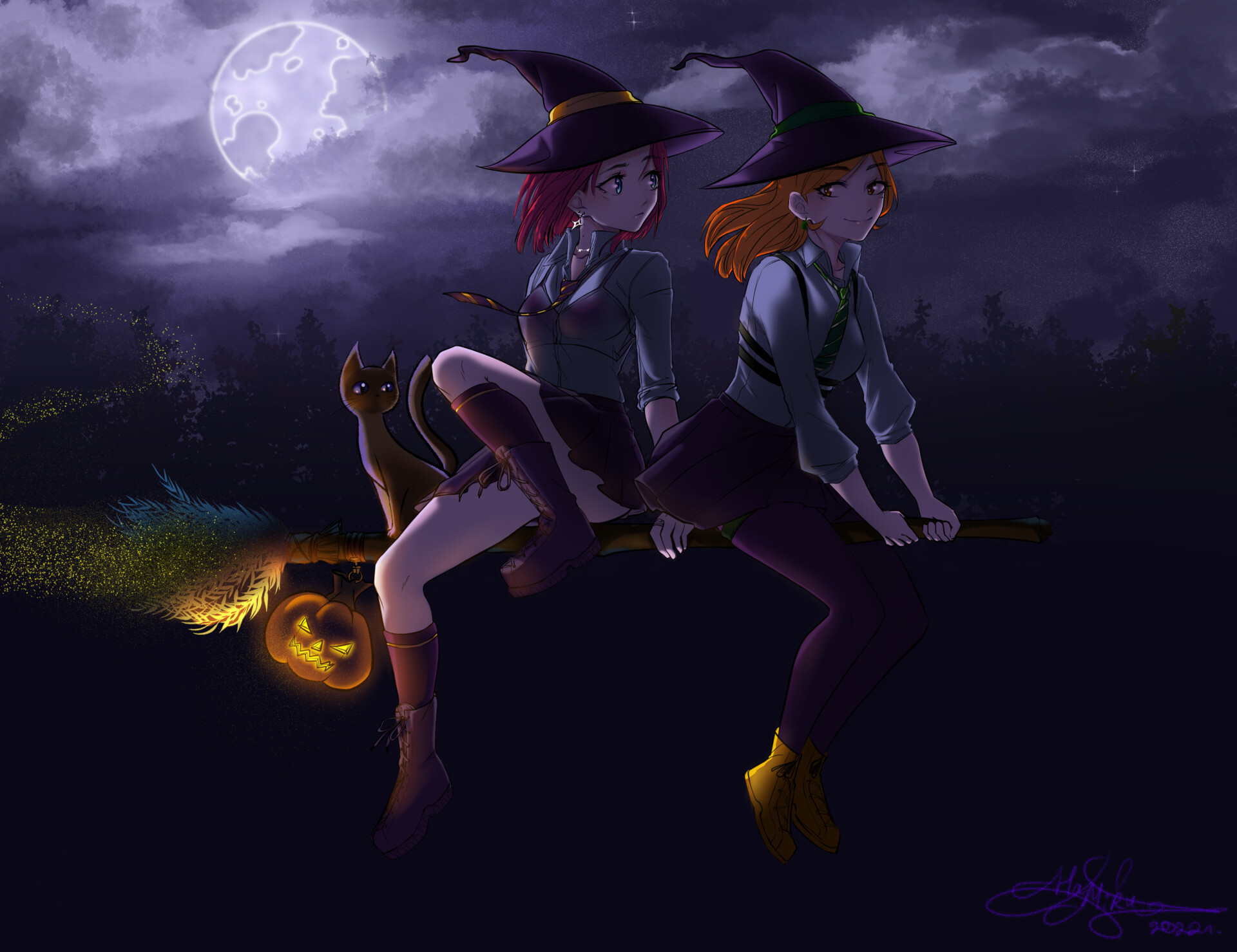 In the Harry Potter universe, 2 witches fly over a dark forest