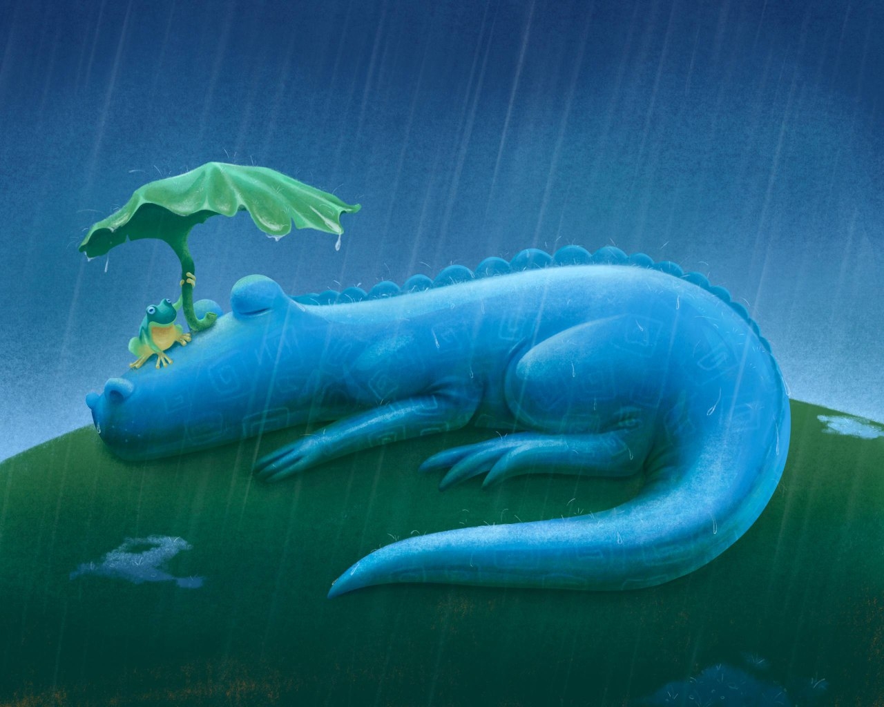 Серия иллюстраций про маленького (относительно) драконо-яшера. Дождь.