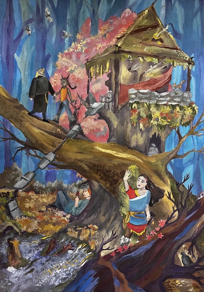 Идея была в том, чтобы изобразить ответ природы на действия человека, которые вредят экологии. Но почему-то в процессе я ушла не туда, и получилась вот такая «утопия», когда лес пытается быть похожим на человека, а люди на него, и образуется гармония в моем понимании. Захотелось ярких персонажей и немного мистики.