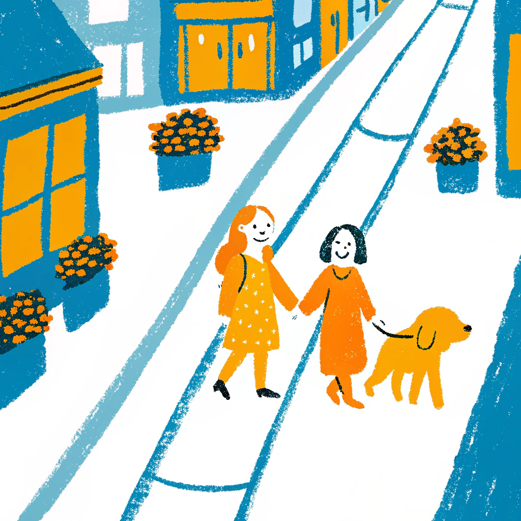 Эта иллюстрация выполнена в игривом стиле, для которого характерны смелые текстурированные линии и ограниченная яркая цветовая палитра, в которой преобладают жизнерадостные оттенки синего, оранжевого и желтого. На снимке изображена очаровательная городская улица, украшенная цветочными горшками, простыми фасадами зданий и трамвайными рельсами, которые создают ощущение направления и глубины. В центре две улыбающиеся девушки, держась за руки, выгуливают дружелюбную собаку, излучая тепло, дружбу и радость. Персонажи нарисованы в простых стилизованных формах, которые придают произведению детскую невинность и универсальную привлекательность. Использование ровных цветов и грубых текстур, похожих на цветные карандаши, придает изделию характерный вид ручной работы, напоминающий иллюстрации к детским книгам. В целом, это произведение отражает прелесть повседневной городской жизни и человеческих взаимоотношений, что делает его идеальным для редакционных иллюстраций, детских книг, поздравительных открыток и игривых проектов по брендингу.