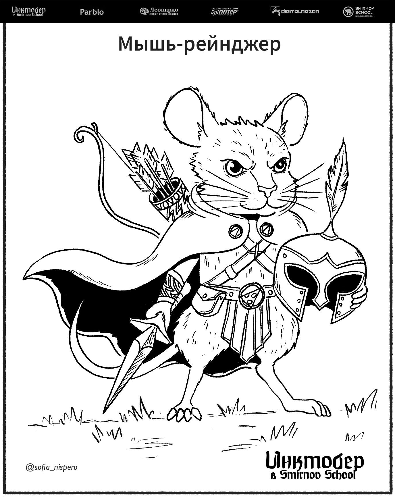 Мышь-рейнджер для Инктобера, в стиле комикса, персонаж для настольной карточной игры DnD, фэнтези, странник, воин