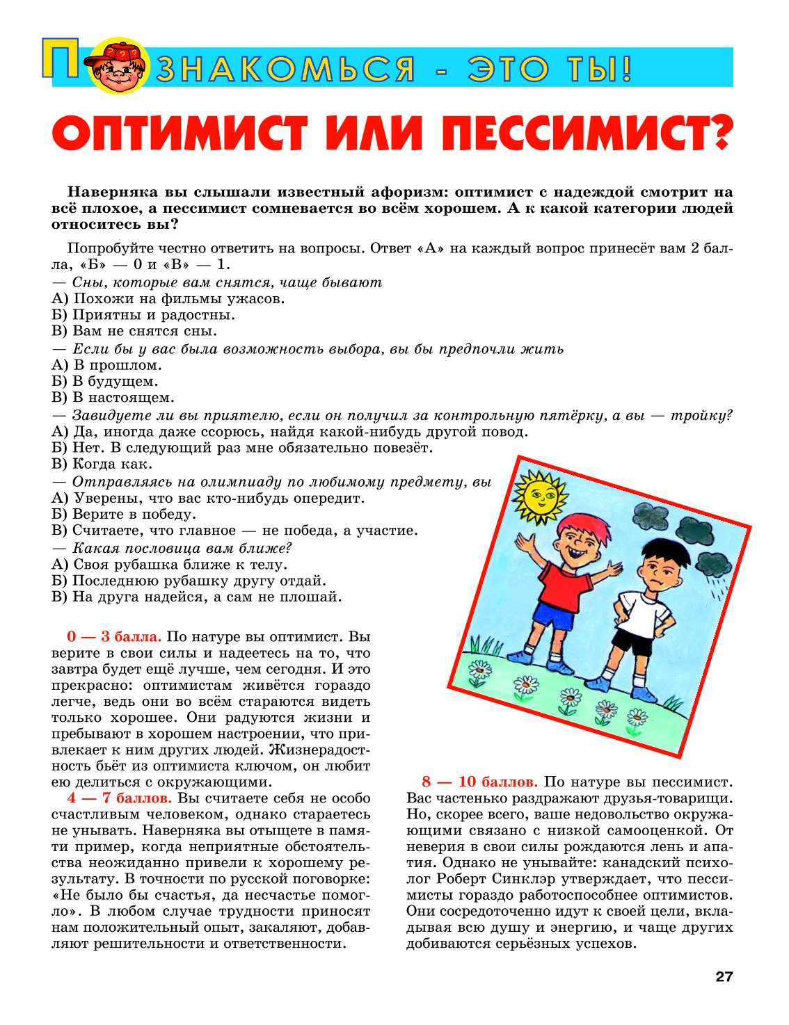 Иллюстрация для журнала "А почему?" Рубрика "Познакомься это ты"(Психологические тесты. Оптимист и Пессимист? ).Художник: Марат Брызгалов.