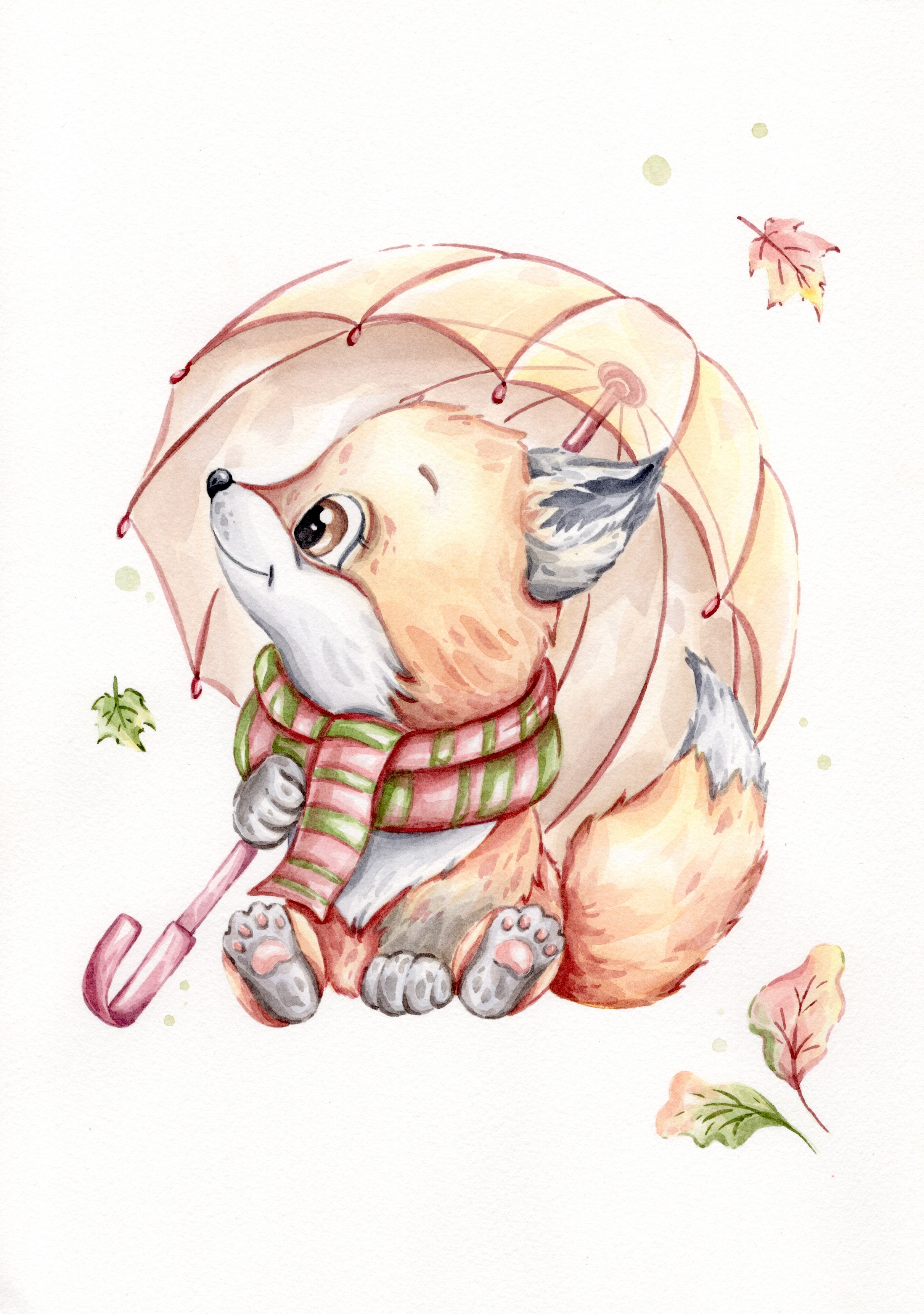 Лисенок с зонтом, акварельная иллюстрация