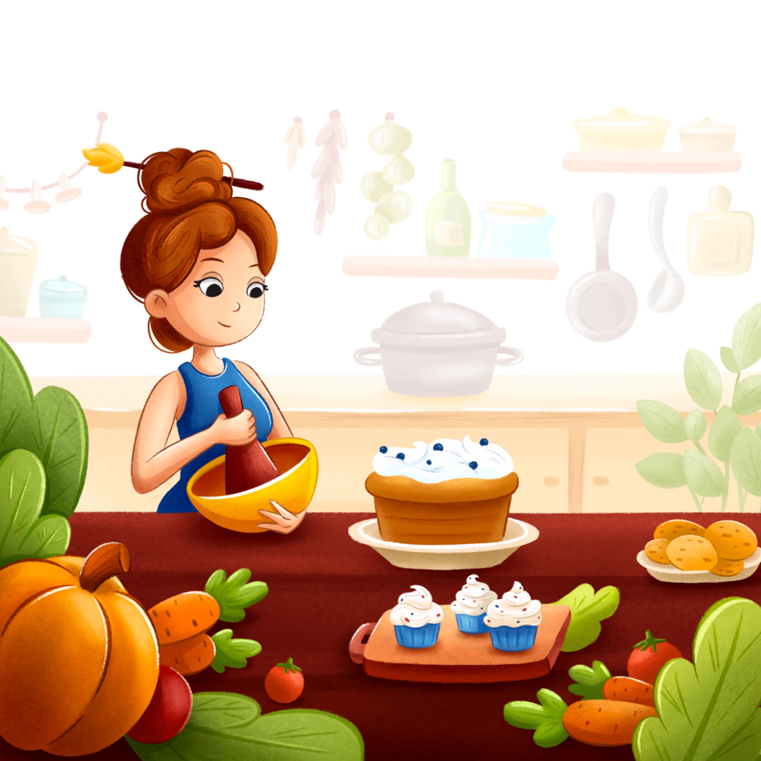 На изображении Клеяна держит золотую глубокую миску и замешивает тесто для торта. На переднем плане овощи, листья салата и деревянная доска с кексами. На заднем плане кухонная утварь .
