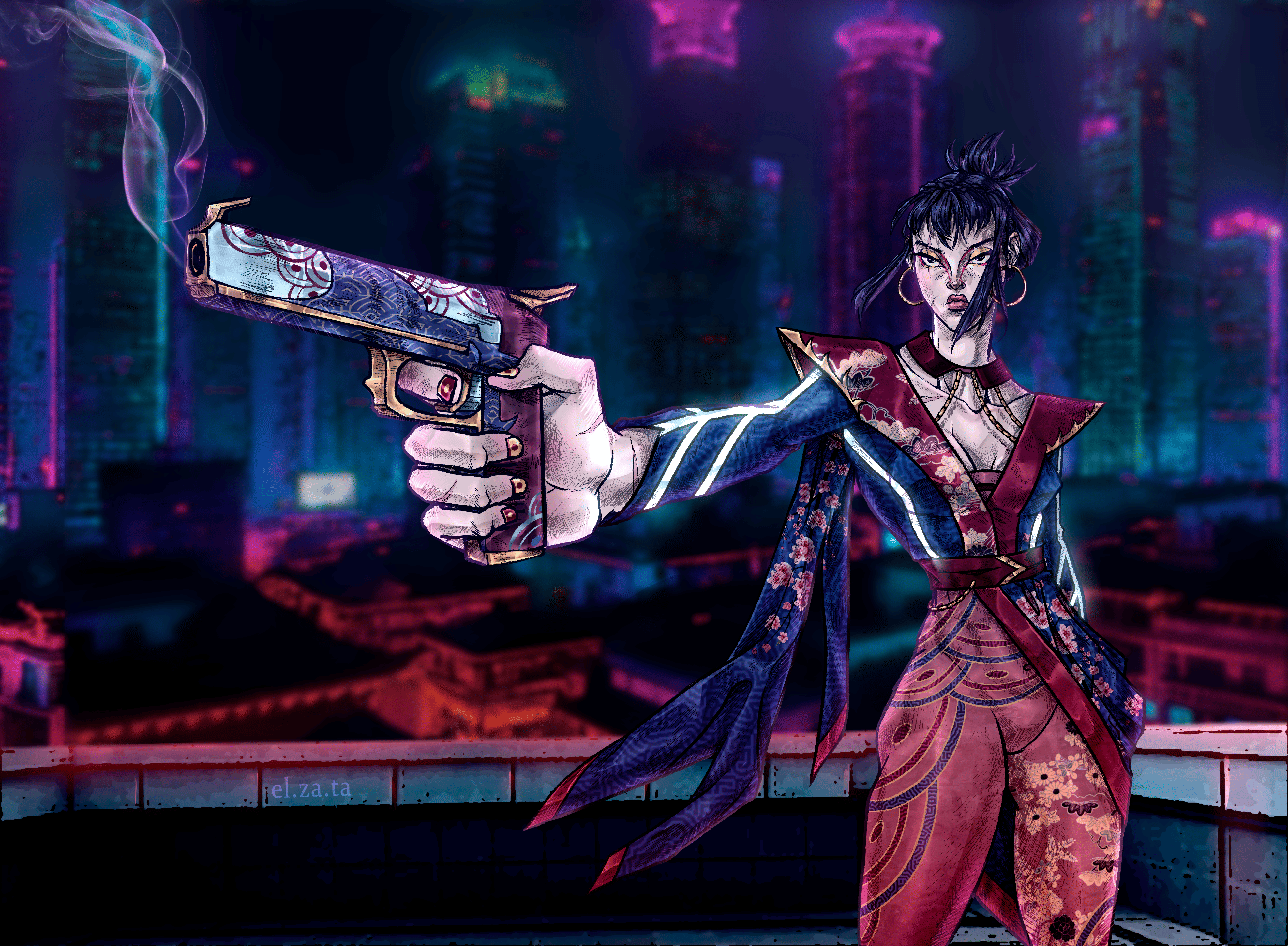 Абстрактная фантазия на тему азиатской моды и киберпанка. Иллюстрация имеет ещё два варианта заднего фона, которые вы можете посмотреть в моем паблике в ВК: https://vk.com/el_za_ta