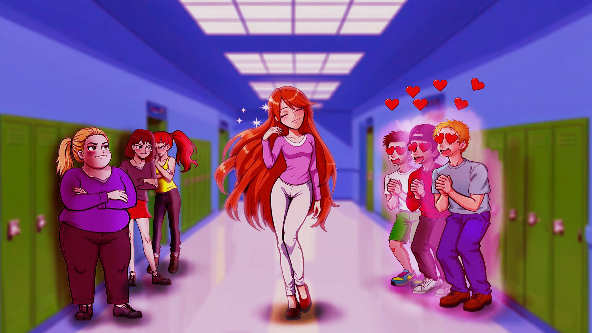 Целью работы было изобразить девушку с рыжими волосами, идущую по школьному коридору. Сверстницы ей завидуют, а парни смотрят на нее с обожанием. Работа выполнена в Adobe Photoshop, с помощь вектор и ретушы. Стиль Аниме.