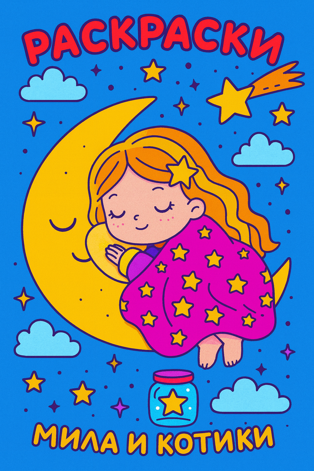 Яркая иллюстрация для сборника раскрасок "Мила и котики". Добрая девочка спит на луне под звёздным одеялом, вокруг - облака и сияющие звёзды. Атмосфера тепла, уюта и волшебства, которая приглашает в мир мечтаний и вдохновения.