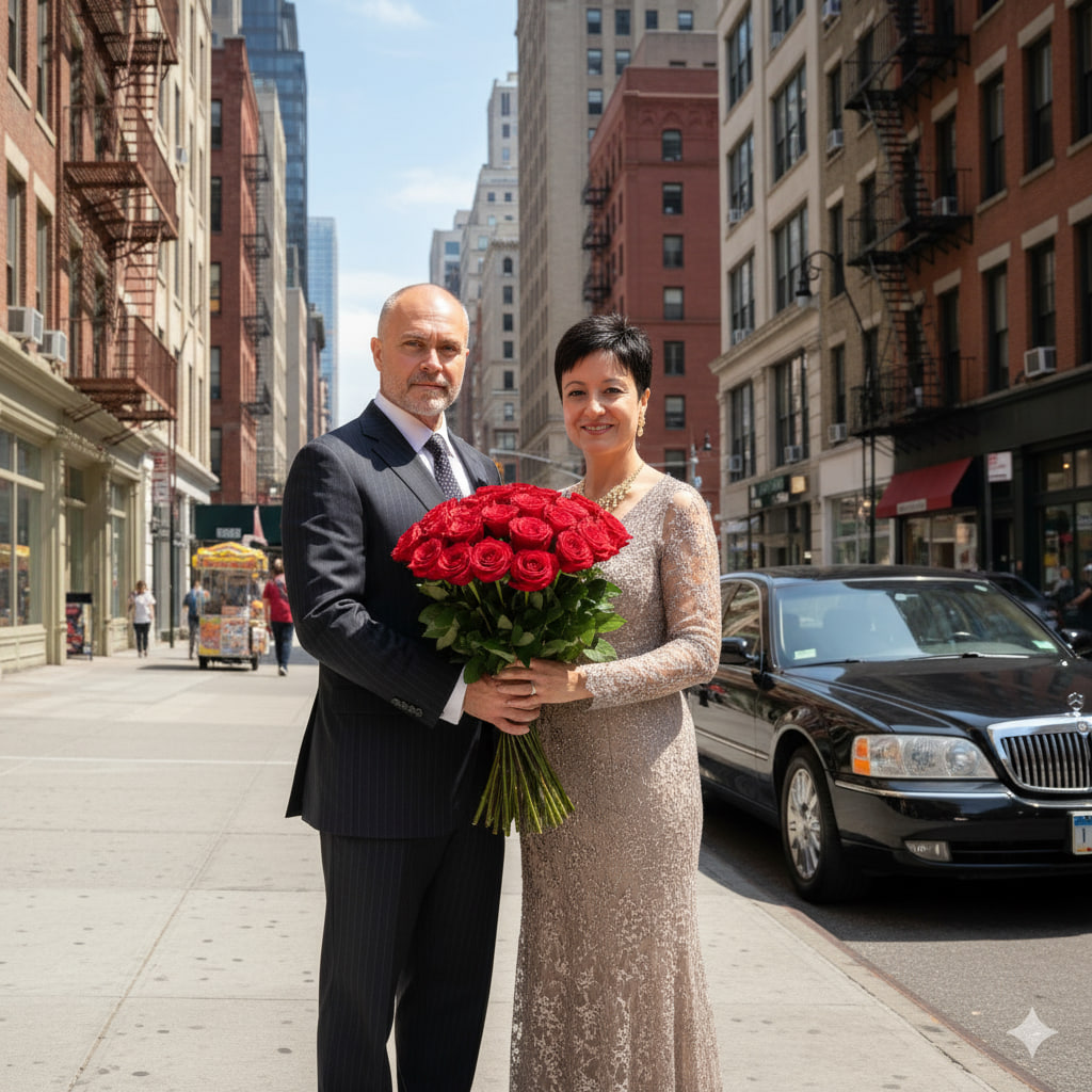 нейрофото на основе 2 реальных фото , изображающее мужчину и женщину с букетом роз на фоне Нью-Йорка