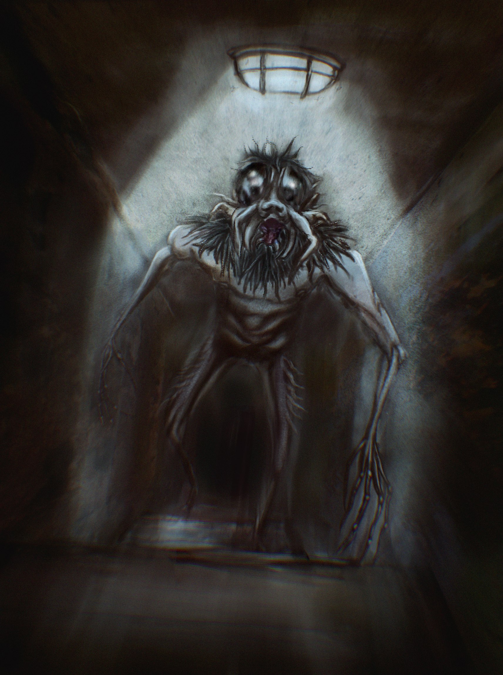 Хоррор иллюстрация с жутким существом. Может подойти как концепт арт для настольной игры или для видео игры, фильма или иного проекта.