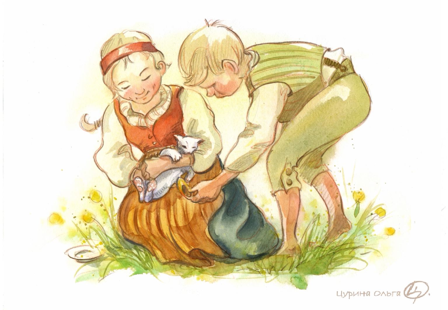 «Ооса уселась на корточки и посадила котёнка к себе на колени, а мальчик стал засовывать его лапу в башмачок.»