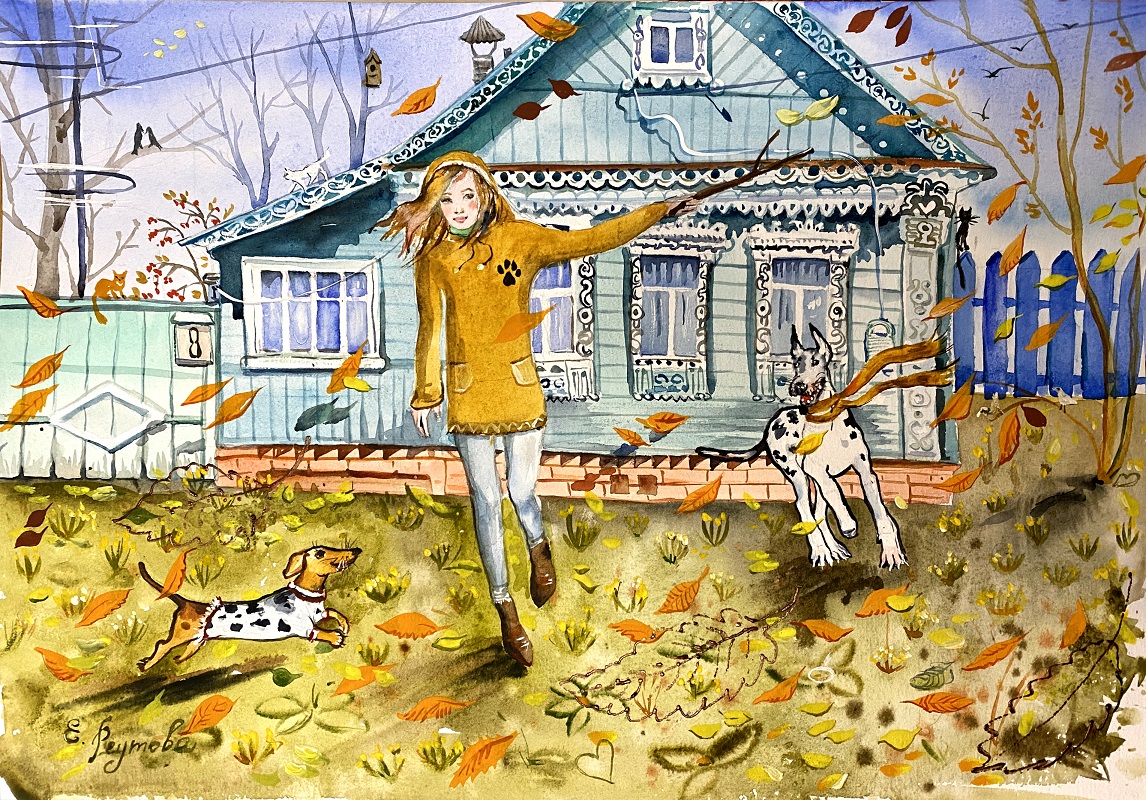 Легкая добрая иллюстрация одного чудесного дня, проведенного с любимыми собаками.
