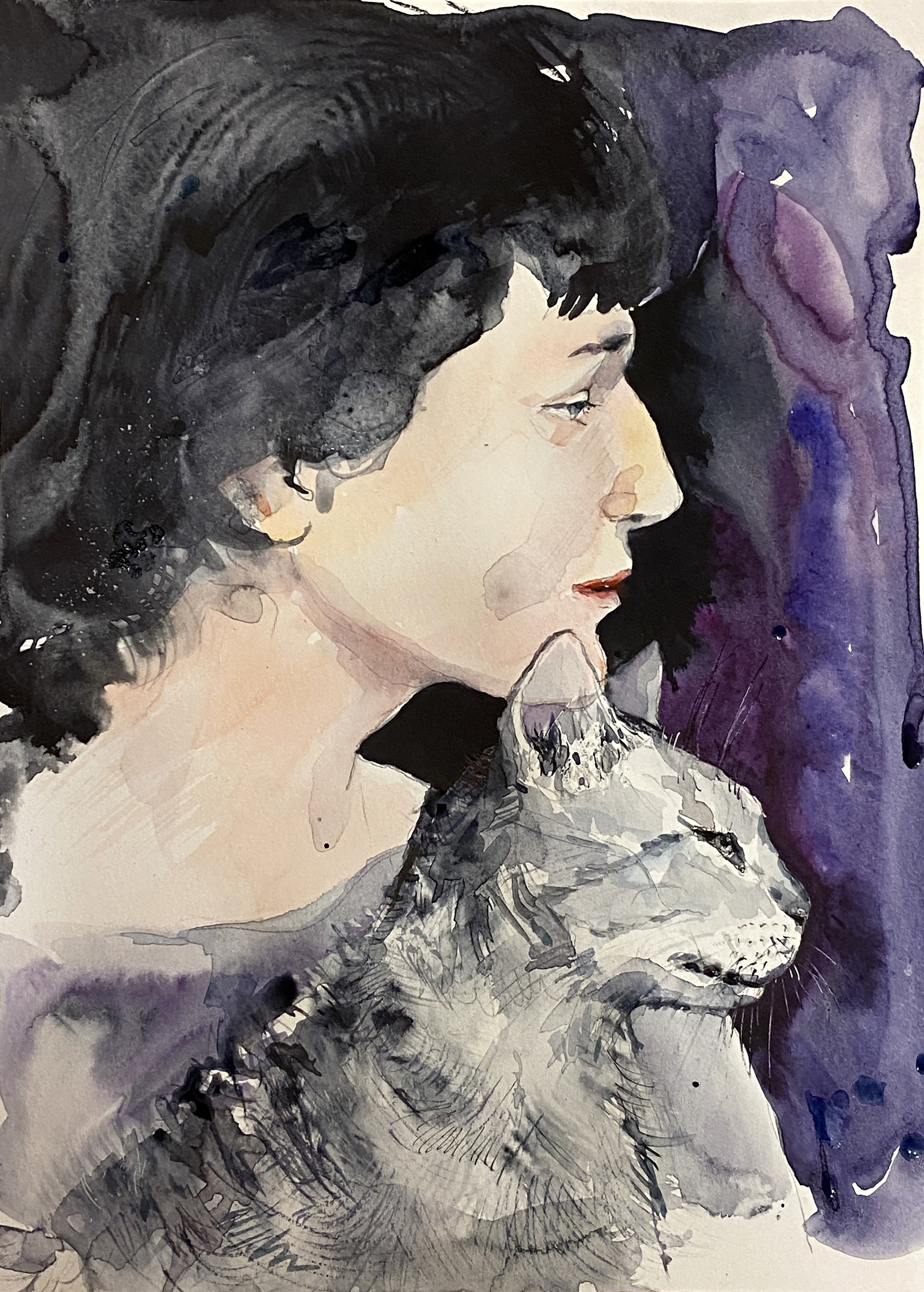 Портрет Анны Ахматовой с кошкой акварелью.