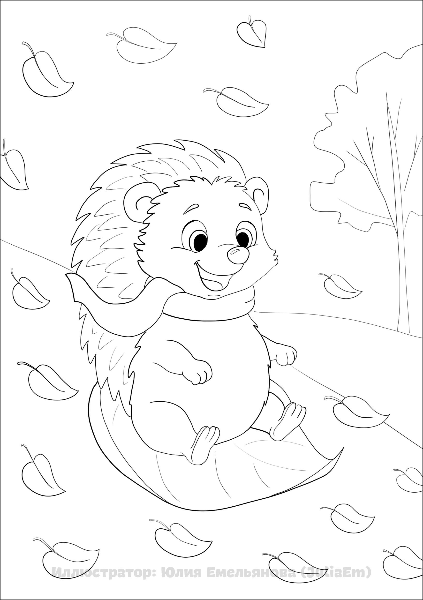 Раскраска для детей. Осень. Ежонок съезжает с горы на листе