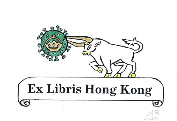 Exlibris для международного конкурса в Гонконге. Тема: "Год быка. Борьба с ковид. Экслибрис вошёл в каталог выставки. Эстампт. Печатная графика S1 шелкография. Ручная раскраска.