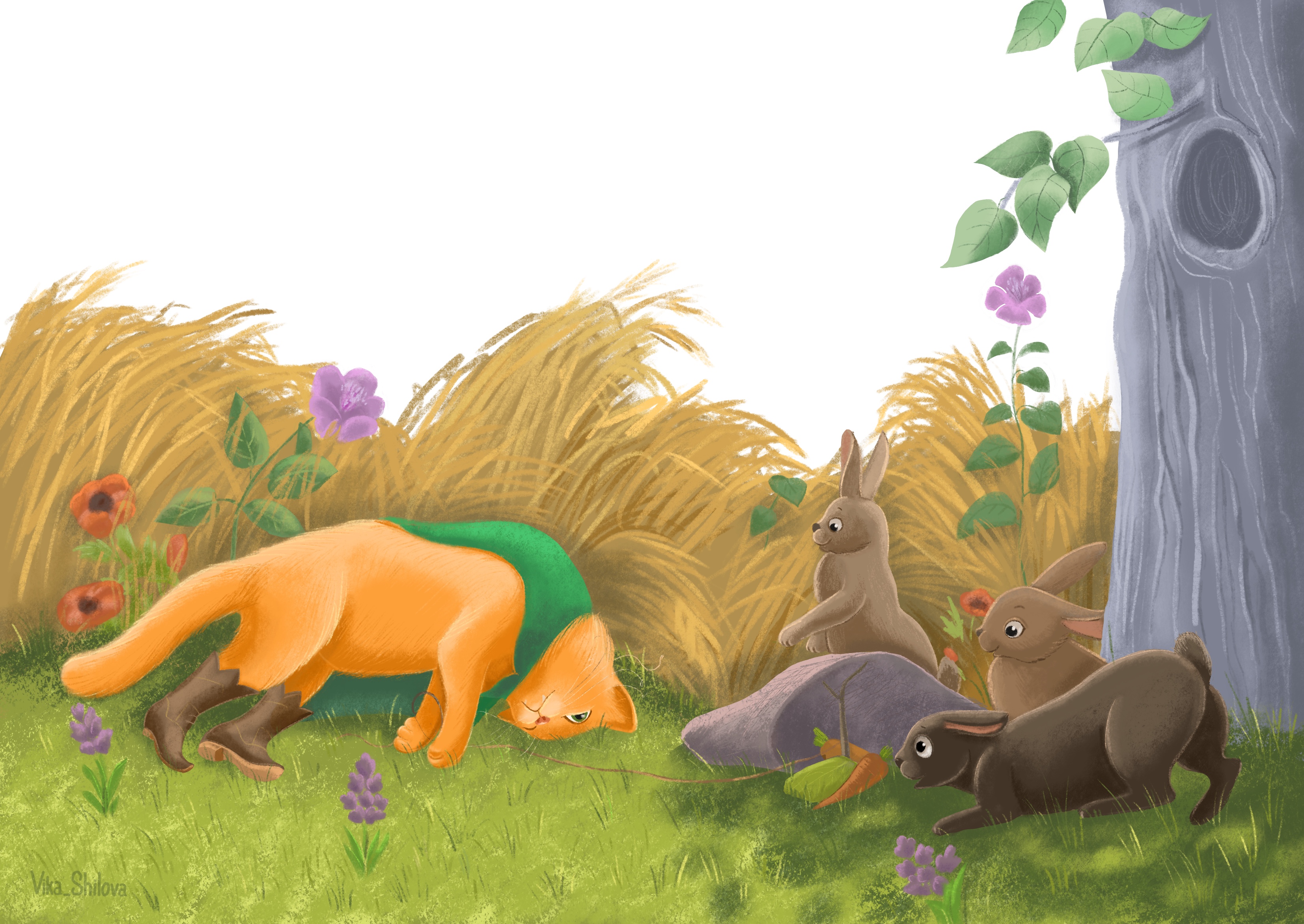 Иллюстрация для сказки "Кот в сапогах". Кот ловит Зайцев для короля.